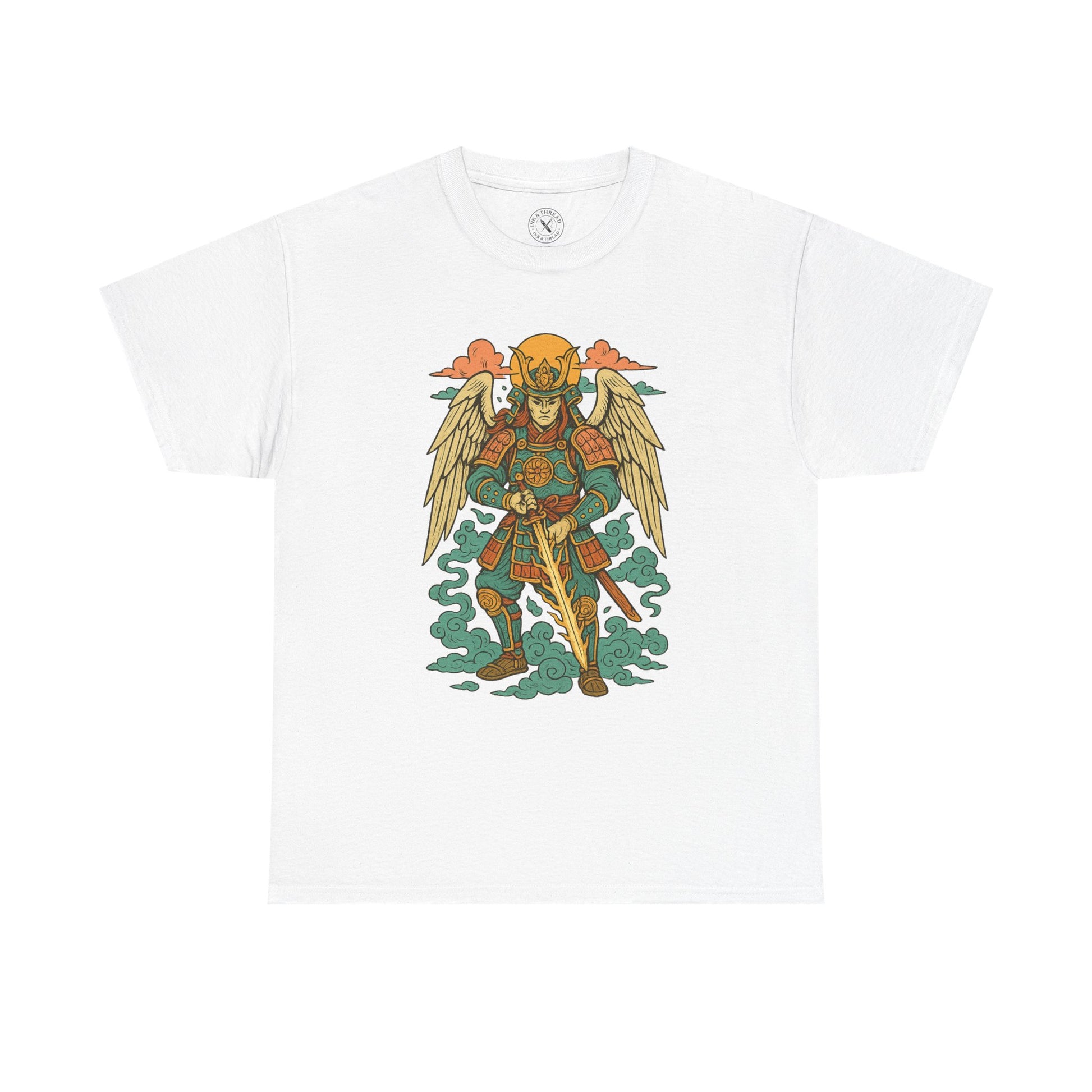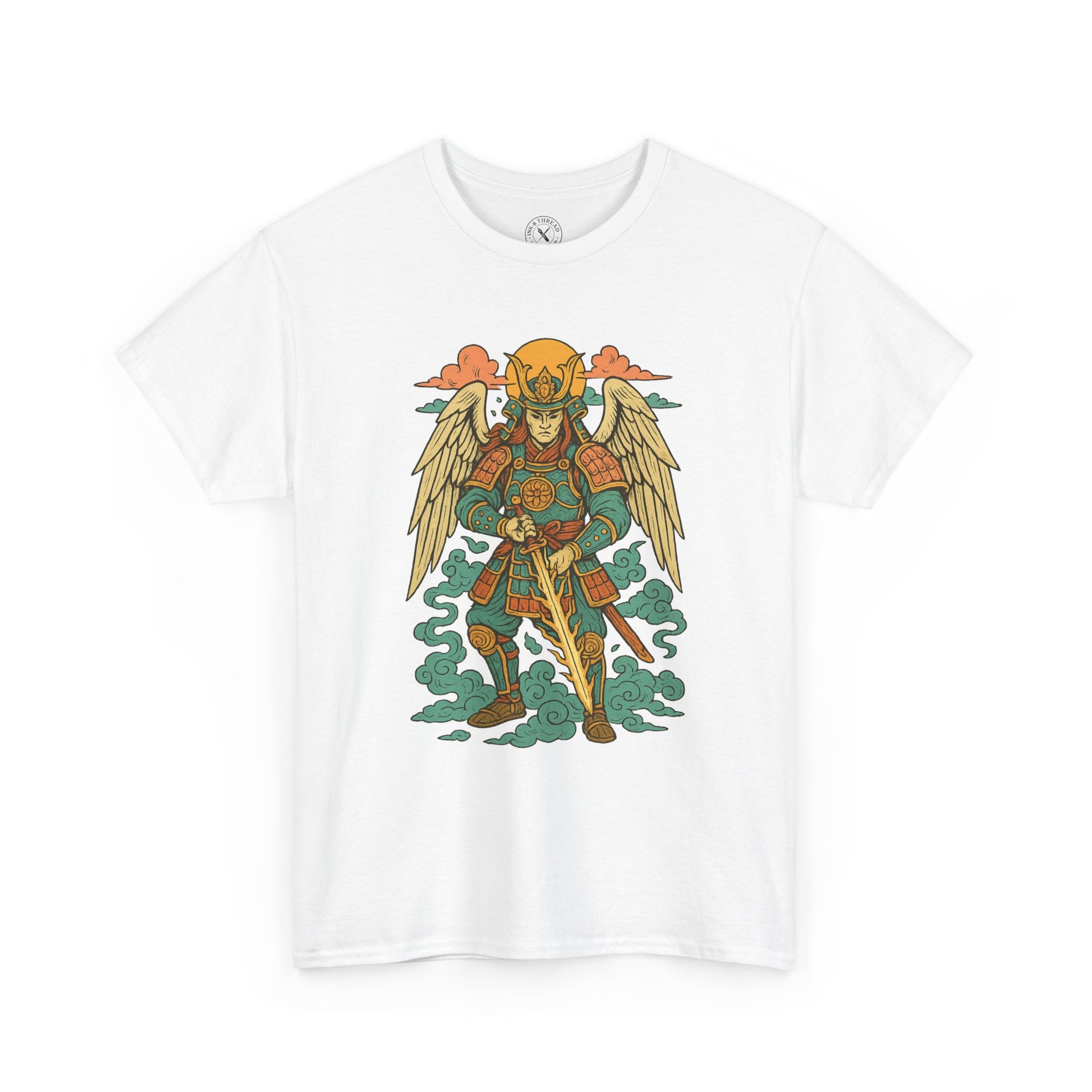 With wide, angelic wings and traditional kabuto armor, he stands amidst swirling clouds in bold pastel linework that radiates power and serenity alike.