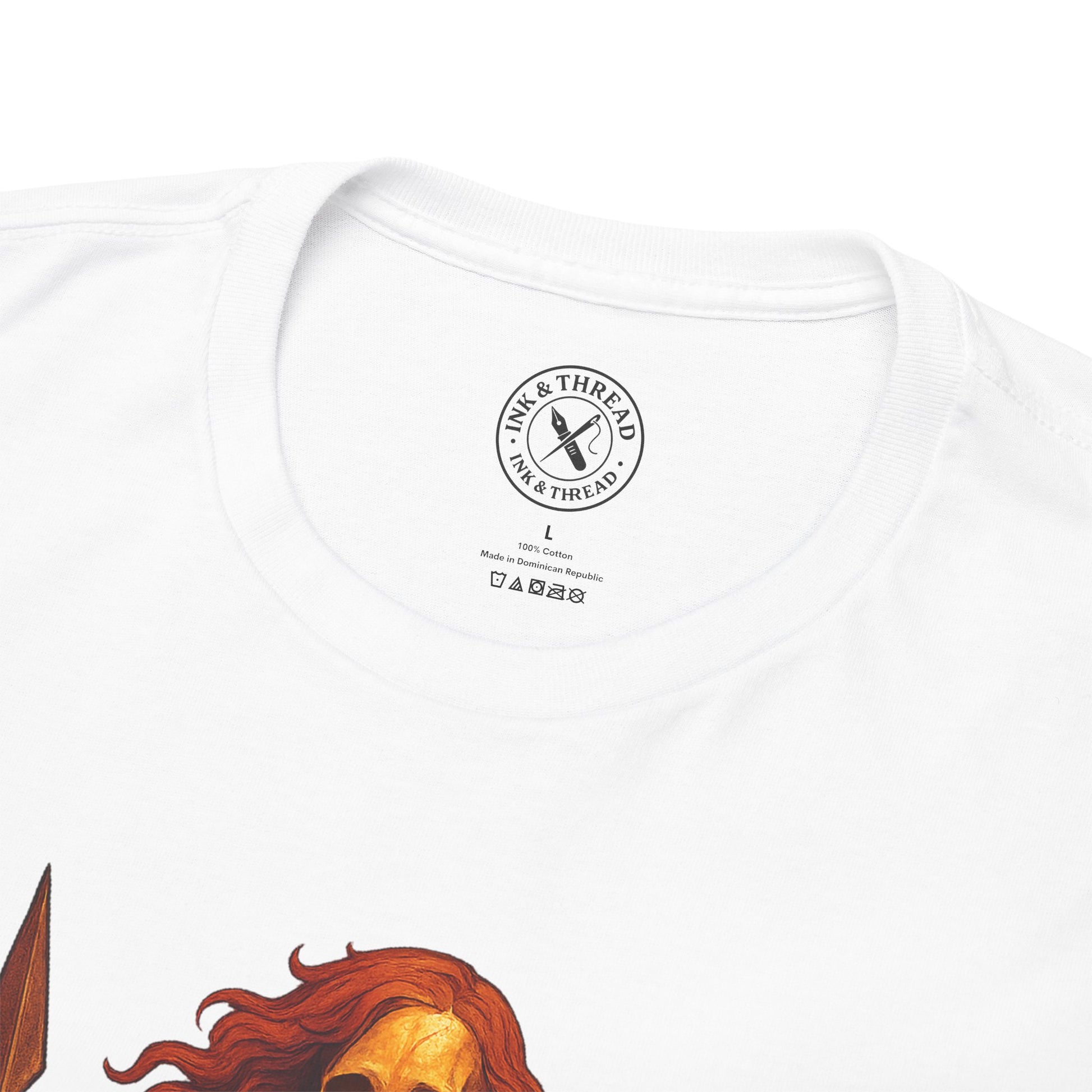 This piece captures divine tragedy — the beauty of immortality wrapped in ruin. Rendered in vibrant pastels of gold, crimson, and violet, The Blood of Elysium radiates both reverence and rebellion. Smooth gradients and refined linework highlight its ethereal presence without heavy etching.
