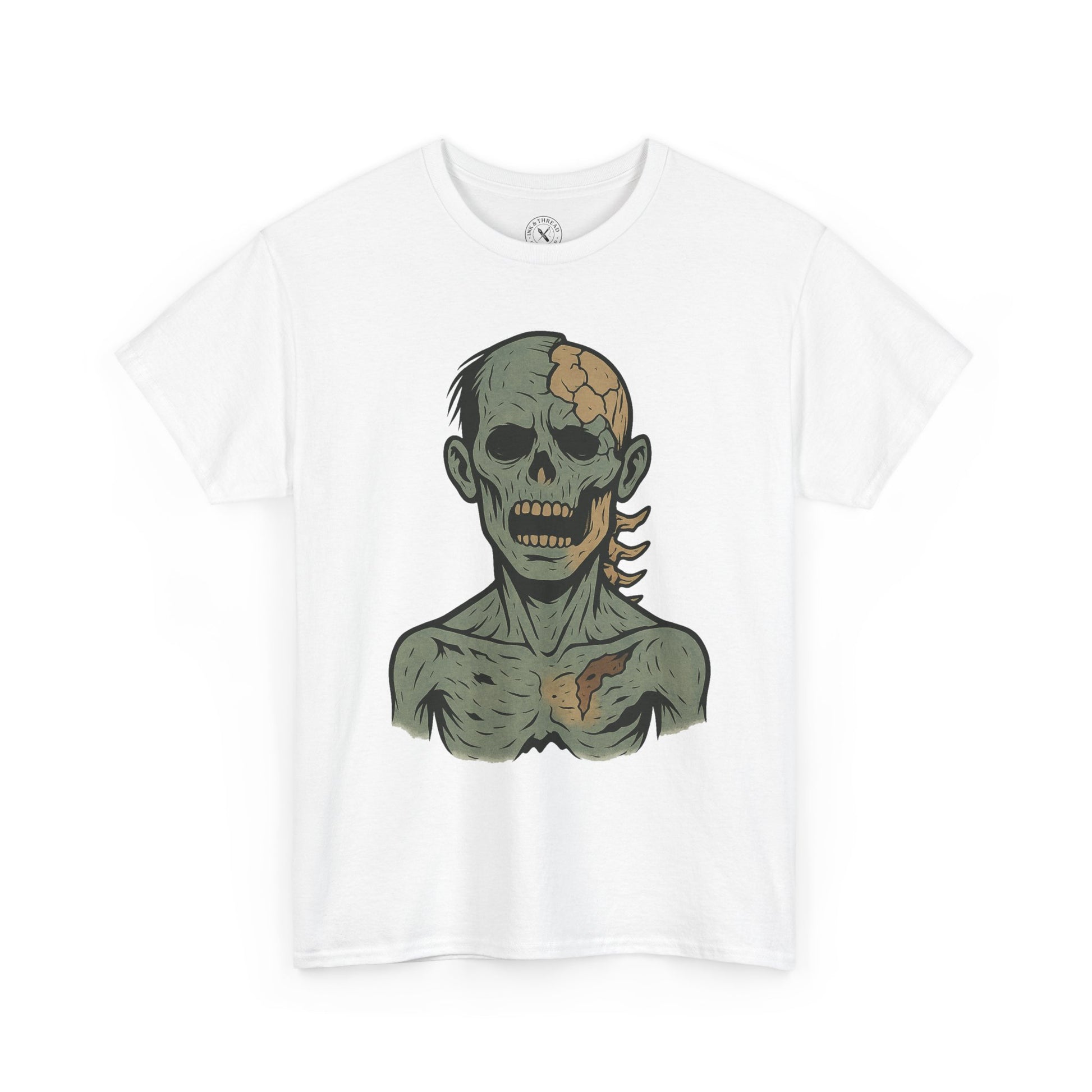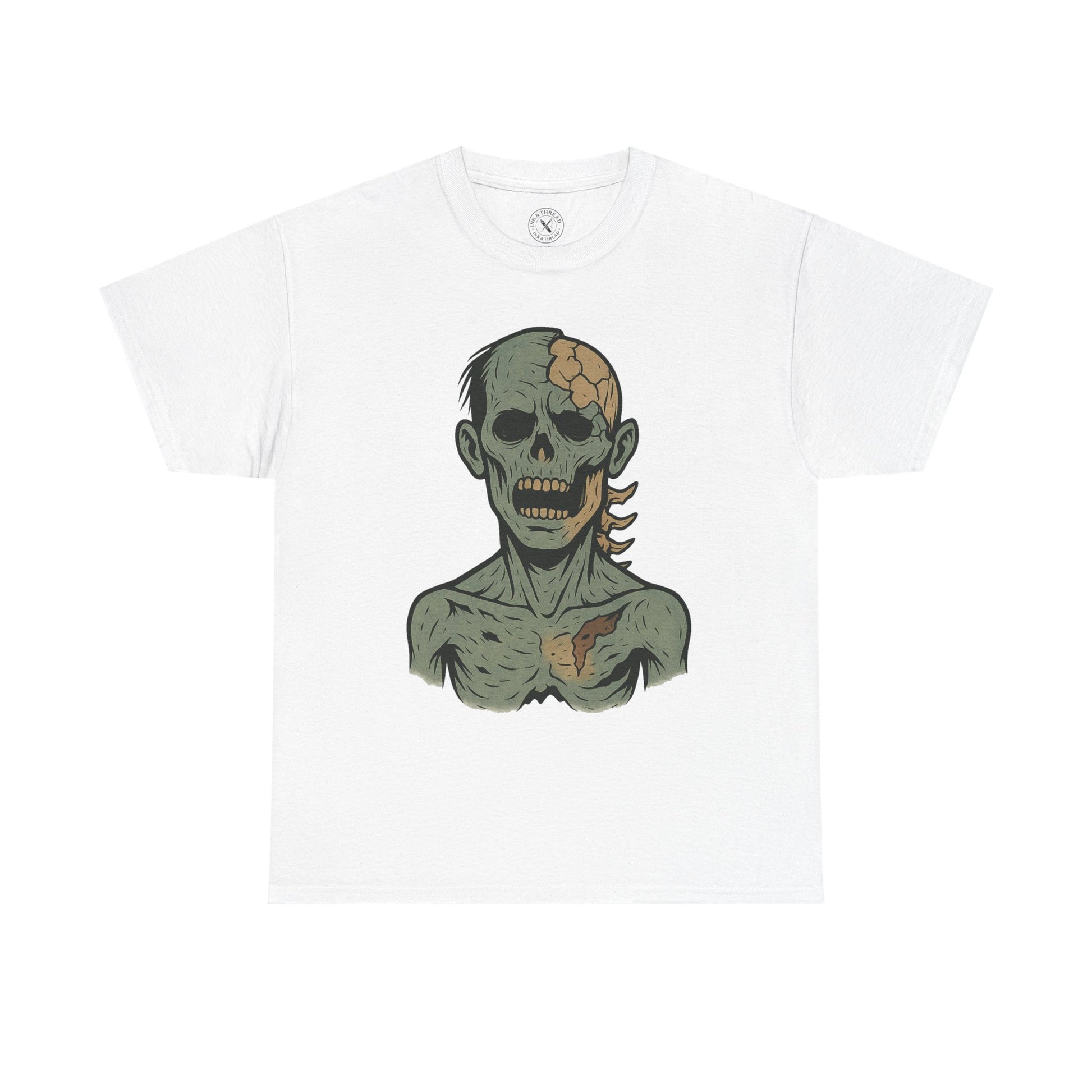 Broken-Earthen blends undead horror with a fractured, stone-like aesthetic. The skull appears cracked and weathered, as if the corpse has clawed its way out of ancient soil, leaving its head split into rough, earthen shards. Pastel corpse tones, bold black outlines, and muted browns give the piece a gritty, geological feel while staying true to the Ink & Thread style.