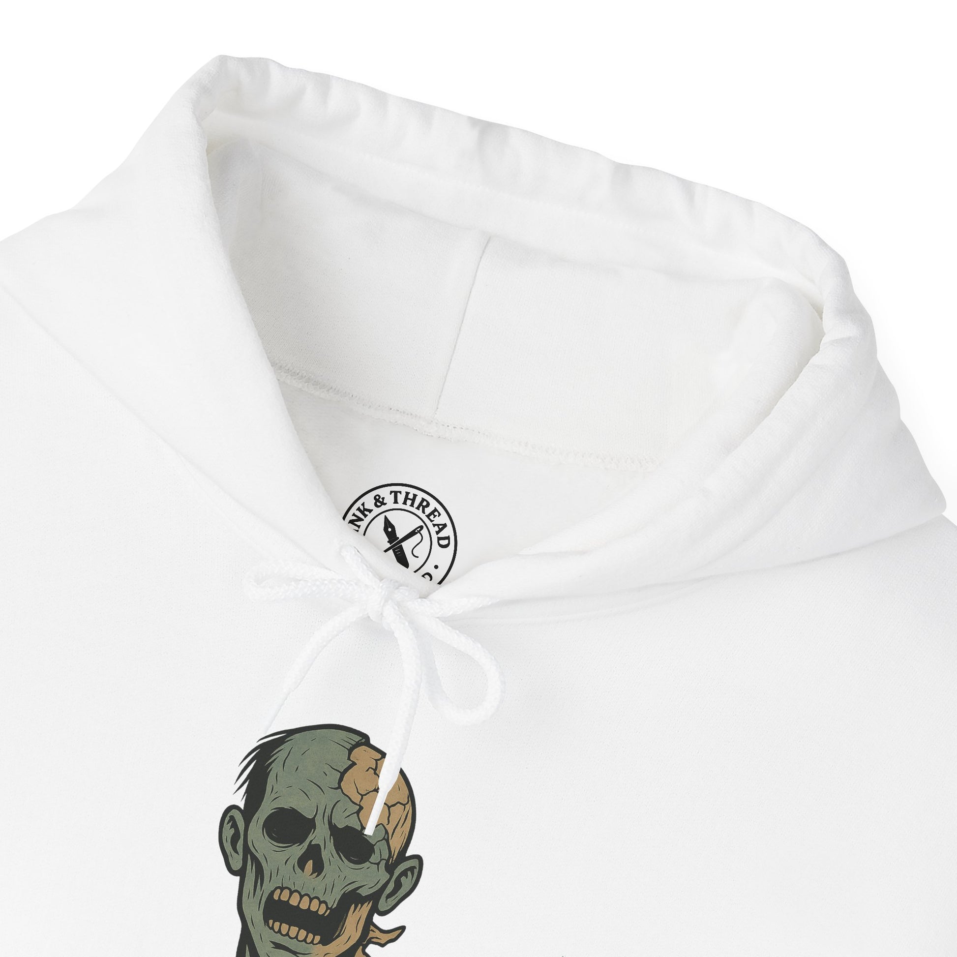 Rendered in the signature Ink & Thread pastel-ink style, the piece uses bold black outlines, muted browns, and subtle corpse greens to create a gritty, sculptural look with no noise, no grain, and a clean print-ready silhouette. The broken skull, sunken eyes, and torn flesh add fierce depth that stands out instantly on heavyweight fabric.