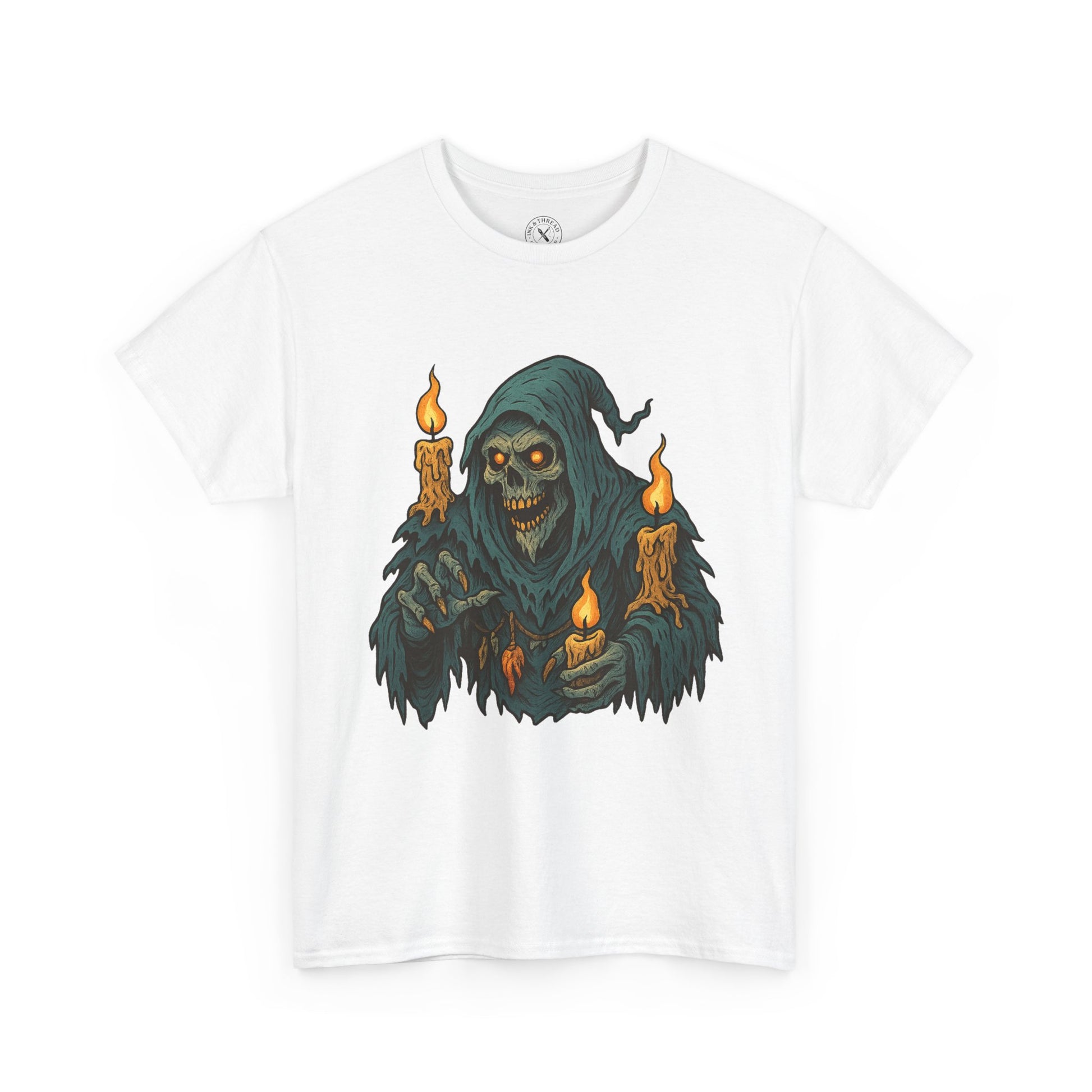 Candlewick Wight drifts through the darkest winter nights, its skeletal grin glowing in the warm flicker of melting candles. Cloaked in tattered frost-stained robes, this undead wanderer carries flames that burn with eerie life, illuminating its hollow eyes and bone-white teeth. Bold ink shading, fiery oranges, and cold blue-greens blend into a haunting contrast — a perfect mix of warmth and dread for the festive season.