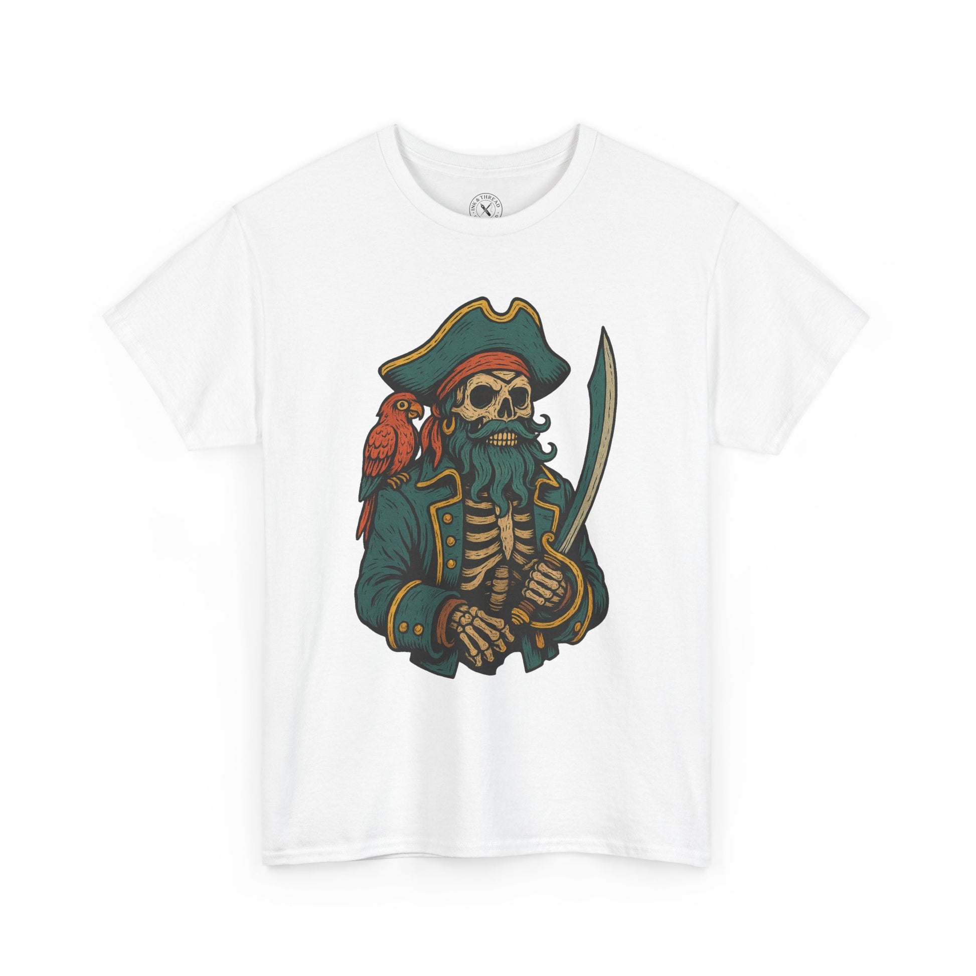 Captain Hollow returns from the deep, a skeletal mariner bound to the helm of a cursed vessel. With burning eyes, cracked ribs, and a ghostly sea-tossed coat, he grips his wheel while tentacles rise in salute. A star guides his path – but no soul dares follow. Rendered in vintage tattoo style with bold lines and vibrant pastels, this design brings undead piracy to life for those drawn to the dark tide.