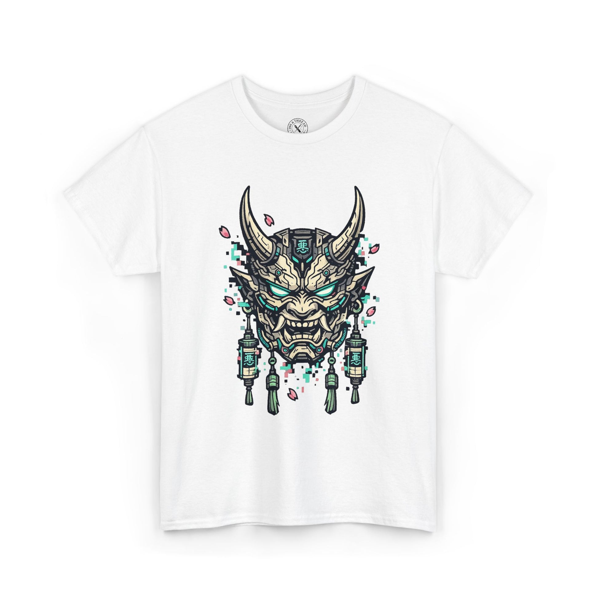 Bold tattoo-style linework defines the mask’s fierce expression, while neon accents and mechanical details hint at a world where spirits and circuitry collide. Pixelated fragments and hanging charms replace falling petals, echoing tradition in a digitised age.