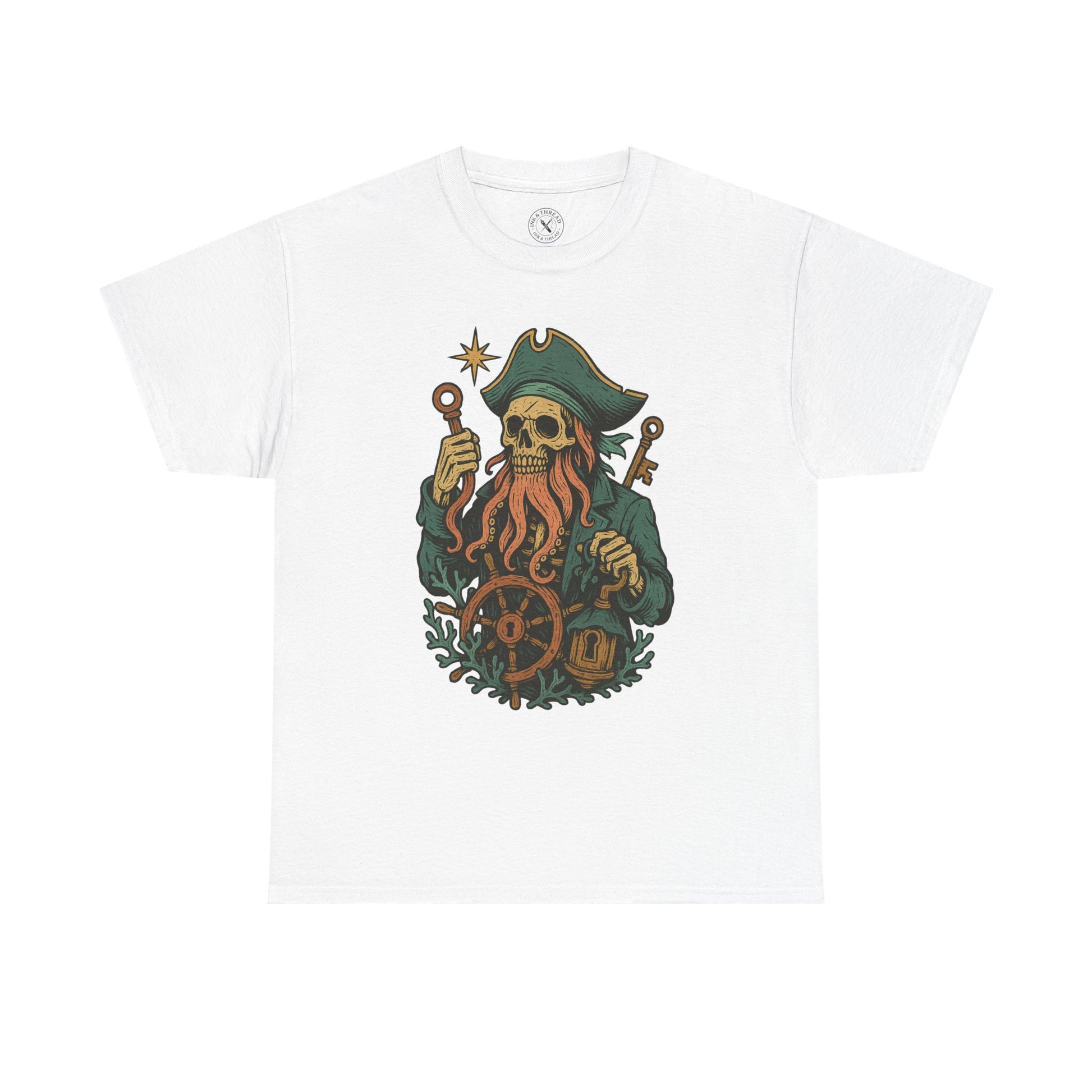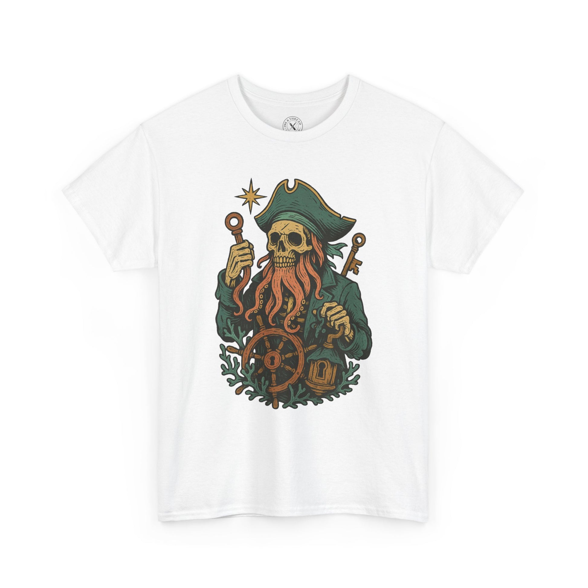 Davy Jones rises from ocean lore in this hand-drawn design, rendered in bold vintage linework and haunting pastels. A skeletal pirate captain grips a lantern and rusted key, steering his cursed vessel with a coral-entwined ship’s wheel. His beard flows like tentacles, and his gaze is locked on the next soul to drag below. A tribute to legends, locks, and the tide no sailor outruns.