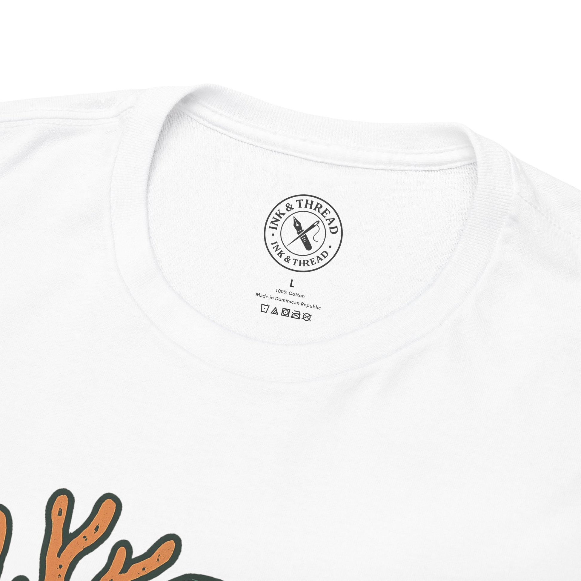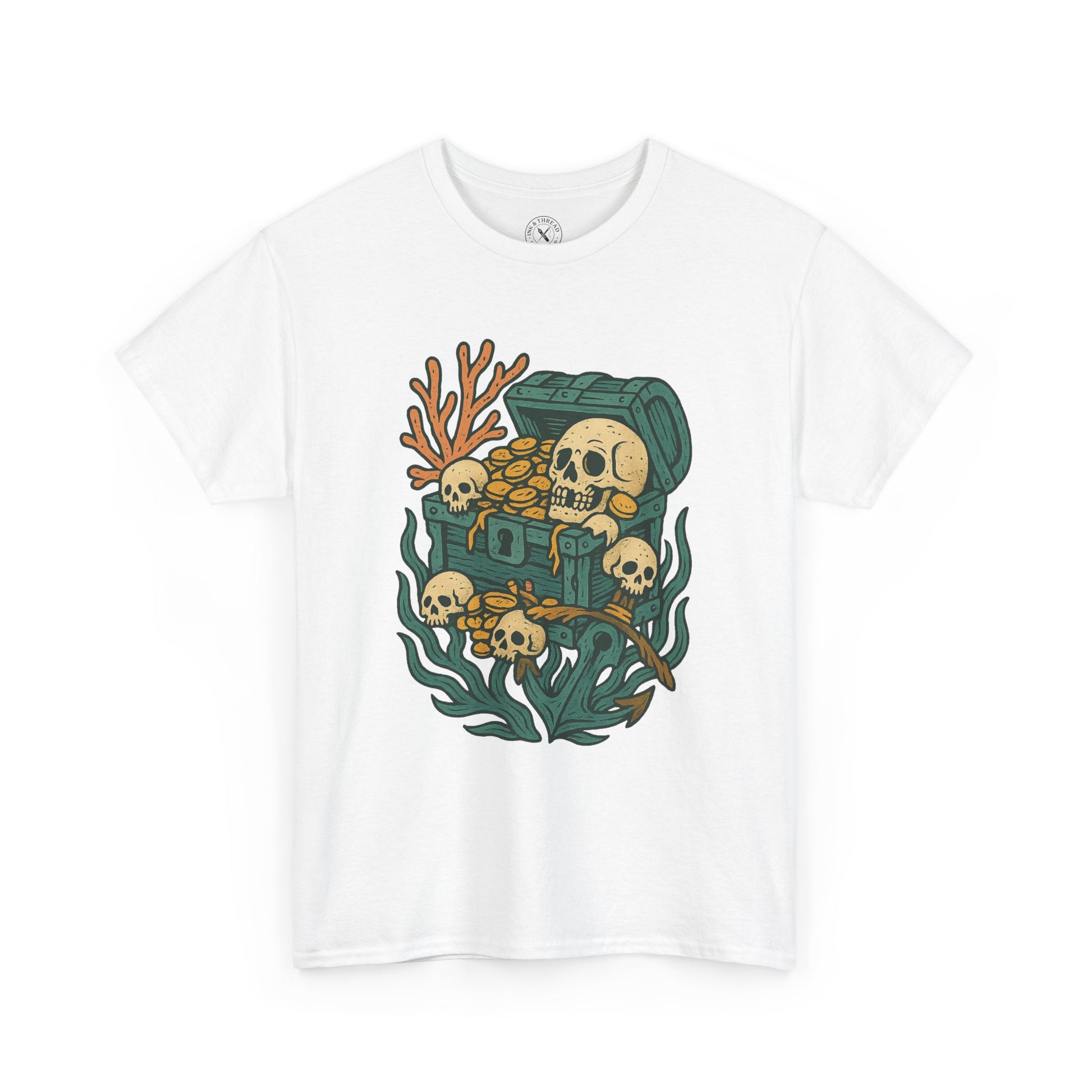 Gold Rot captures the curse of greed beneath the waves – an ancient chest bursting with golden coins, coral, and the skulls of those who tried to claim it. Tangled in seaweed, locked in time, this piece is a haunting reminder that the sea keeps what it wants. Bold linework, pastel tones, and vintage tattoo detail bring this grim bounty to life.