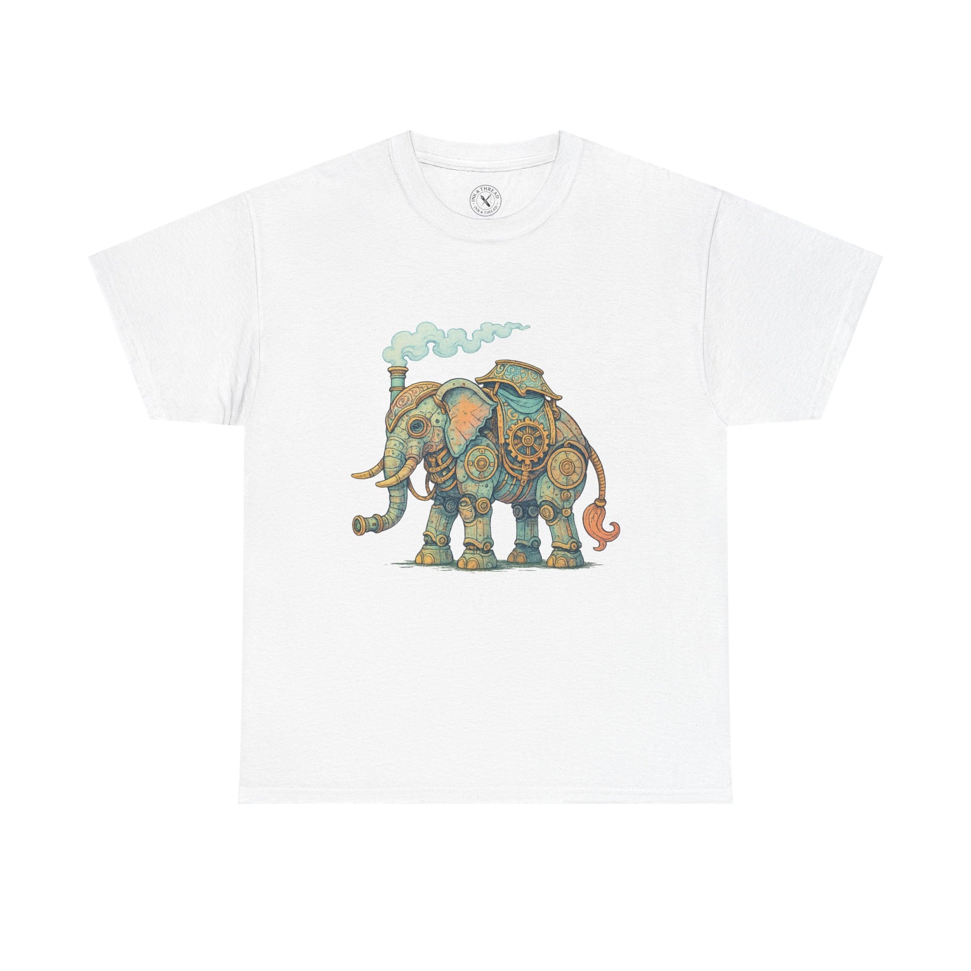 The Iron Pachyderm strides between legend and machine — its vast form inked with circuitry scrollwork, its tusks cast from brass and memory. Towering yet graceful, it exhales pastel vapor from sculpted vents, each footstep echoing like a forge bell.