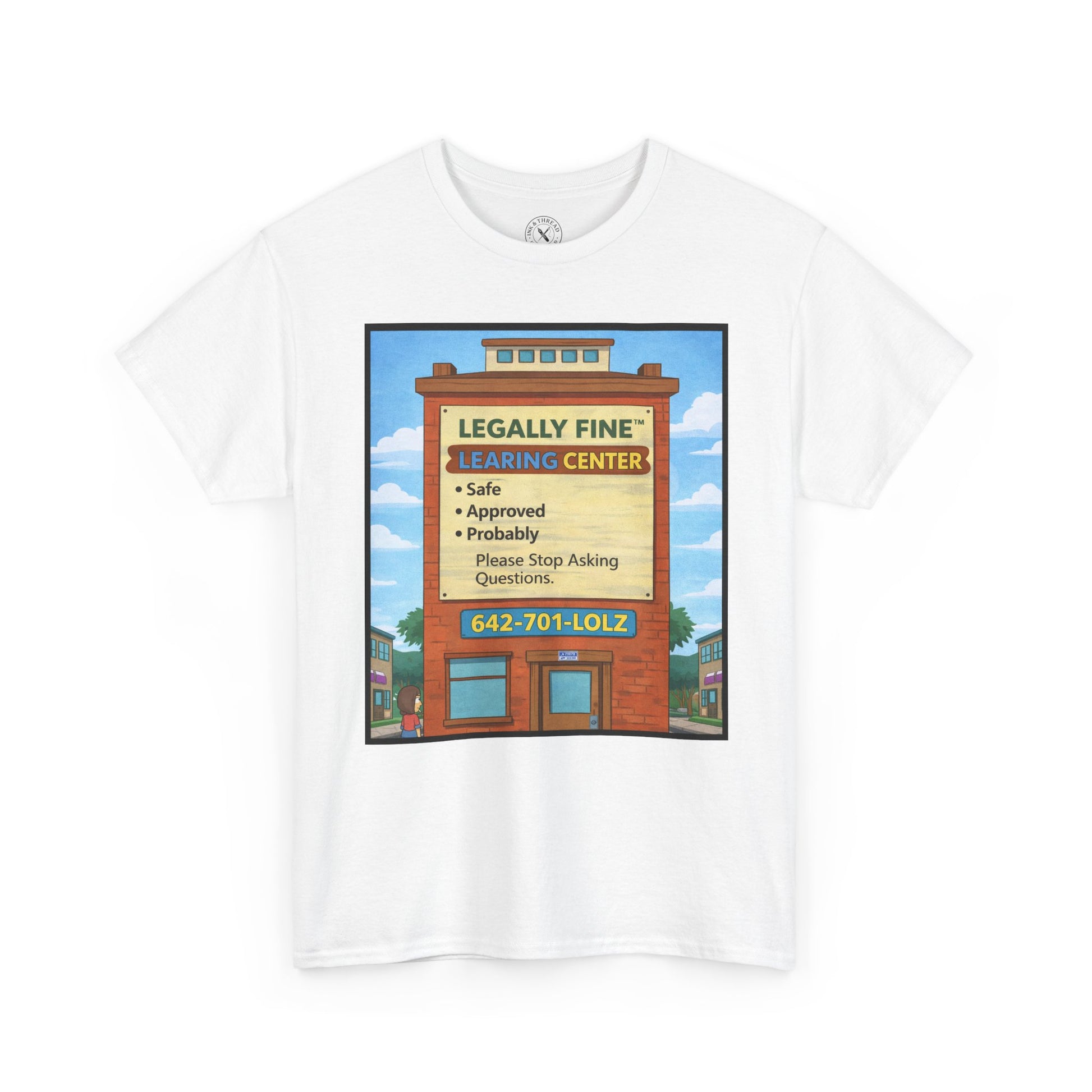 This t-shirt is designed as an official-looking advertisement for a totally legitimate learing center, complete with cheerful colours, reassuring promises, and a spelling choice that inspires immediate confidence.