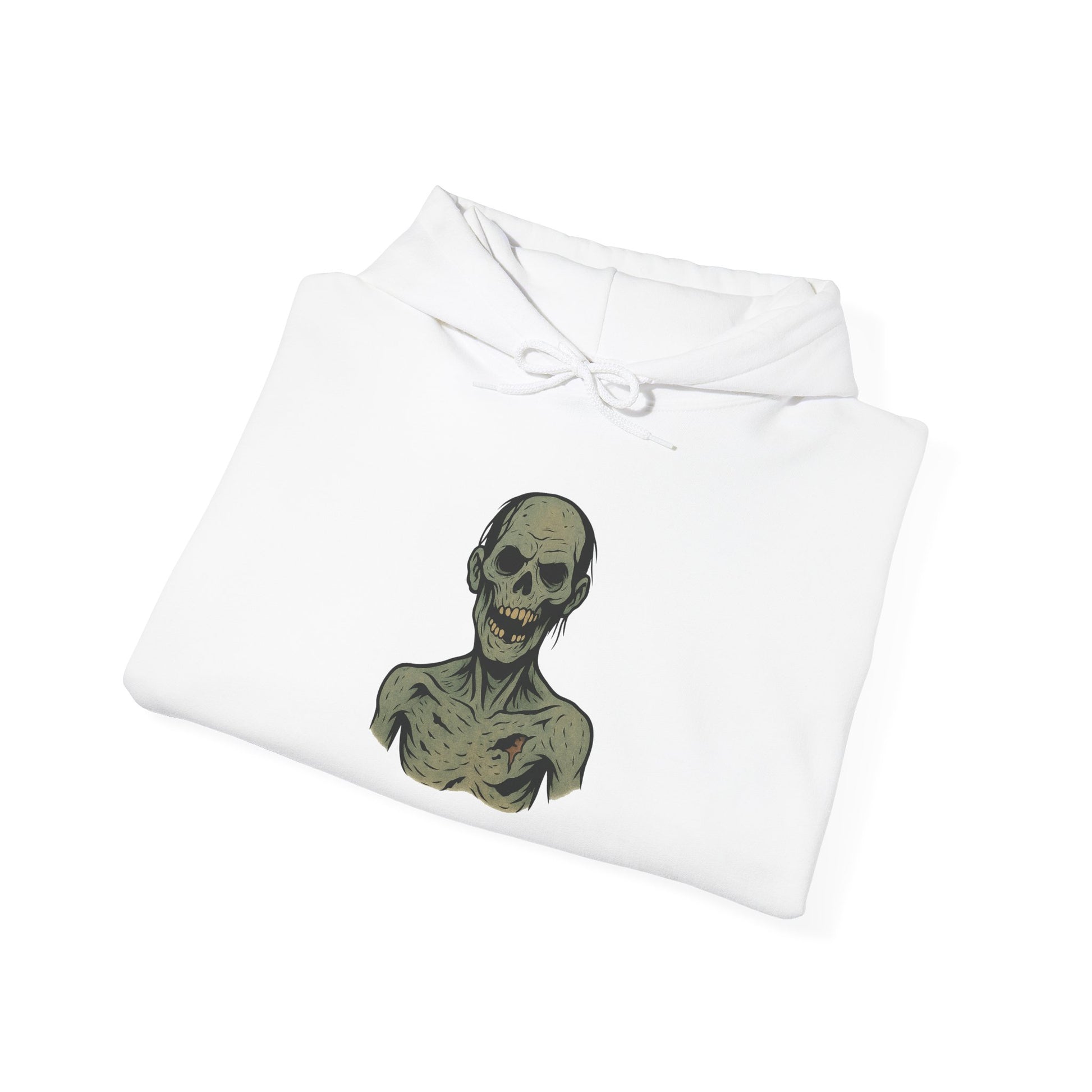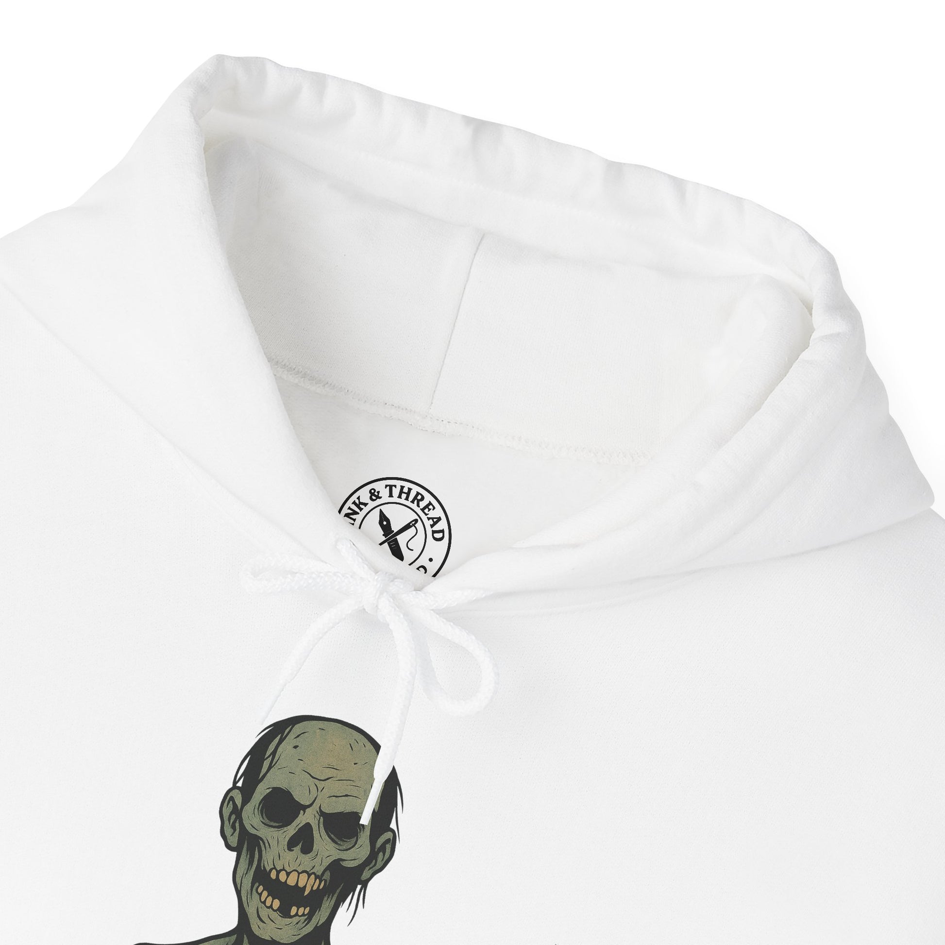 The result is a bold, eerie illustration that stands out flawlessly on hoodies — dark, minimalistic, and unmistakably undead.