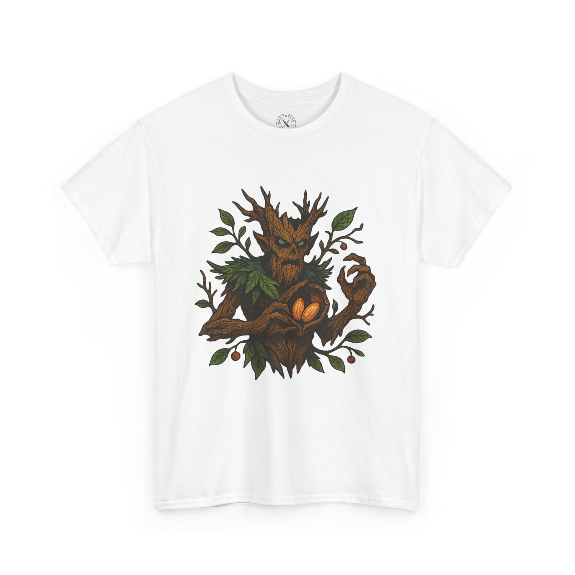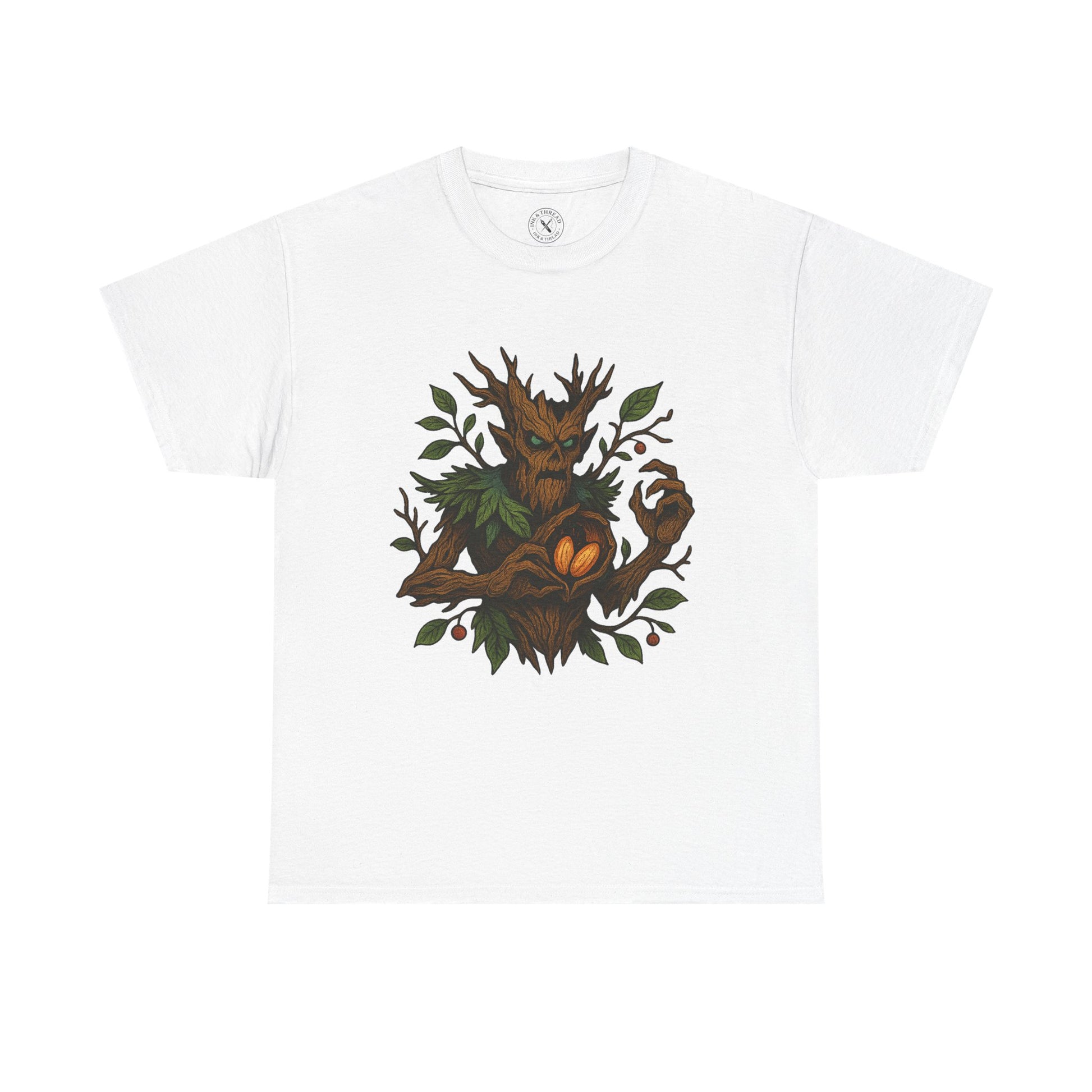 The Midnight Nutgrove is a towering treant spirit carved from ancient walnut wood, brought to life by winter magic. With glowing teal eyes, branch-like limbs, and leaves shimmering in frosted greens, this forest guardian cracks open its chest to reveal two radiant golden seeds—harbingers of both life and doom. Illustrated with bold ink shading, rich earthy tones, and vibrant highlights, this creature blends woodland mystique with eerie holiday energy.