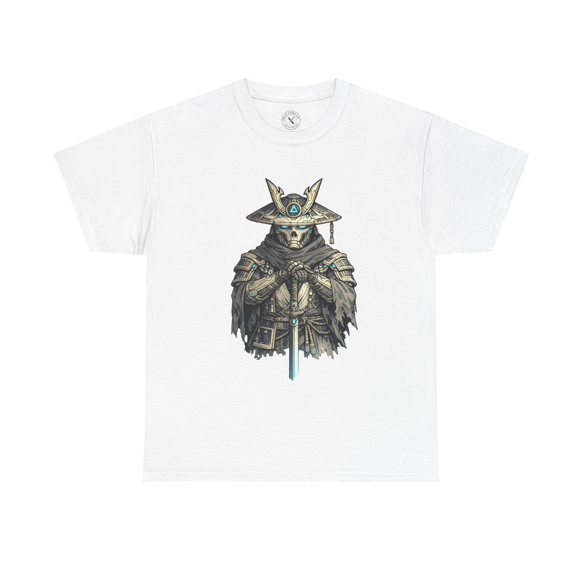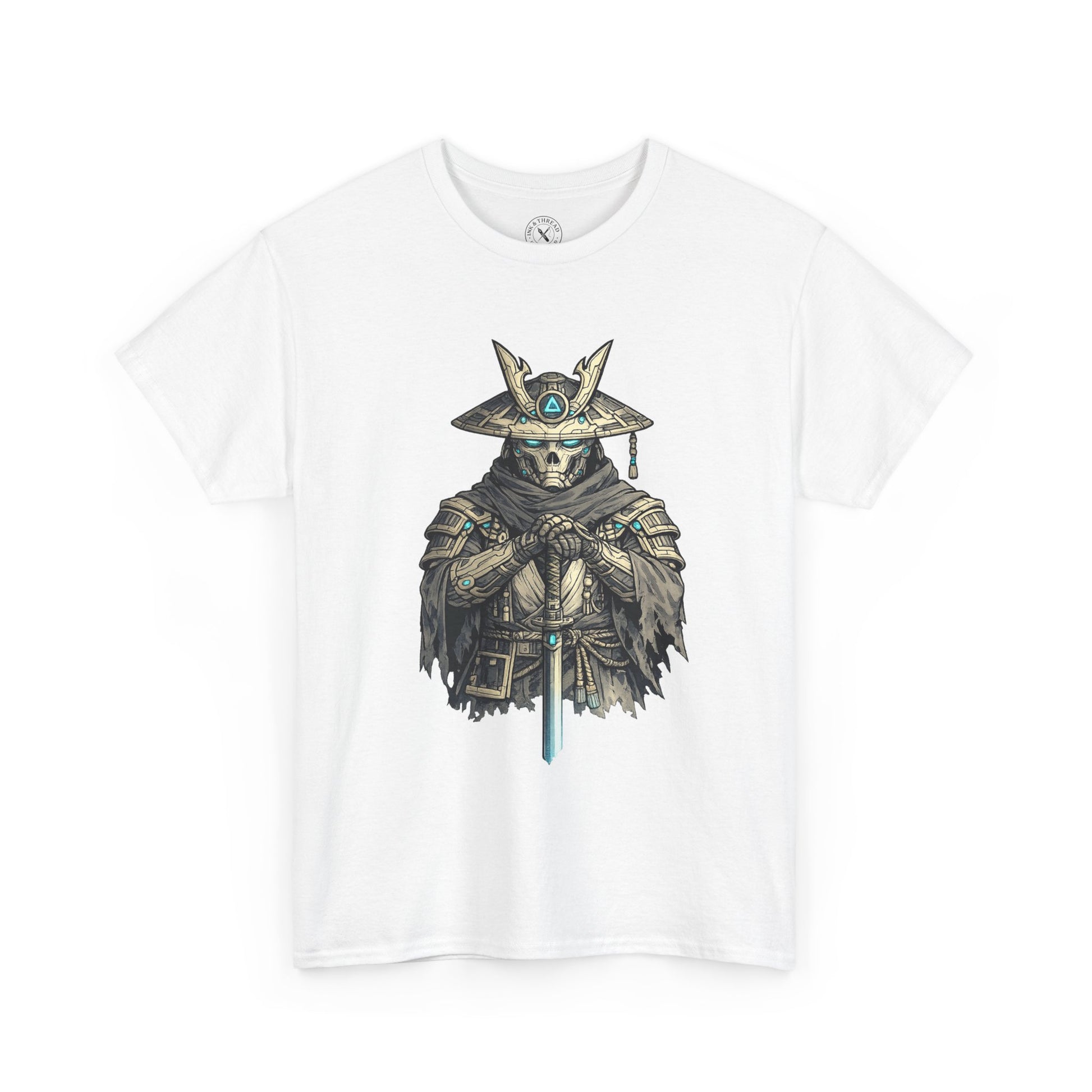 The design balances tradition and futurism through bold ink linework and restrained cyberpunk accents. Mechanical details are integrated subtly into the armour and weapon, preserving the tattoo-first aesthetic while suggesting a synthetic future. There is no motion, no violence, only resolve.