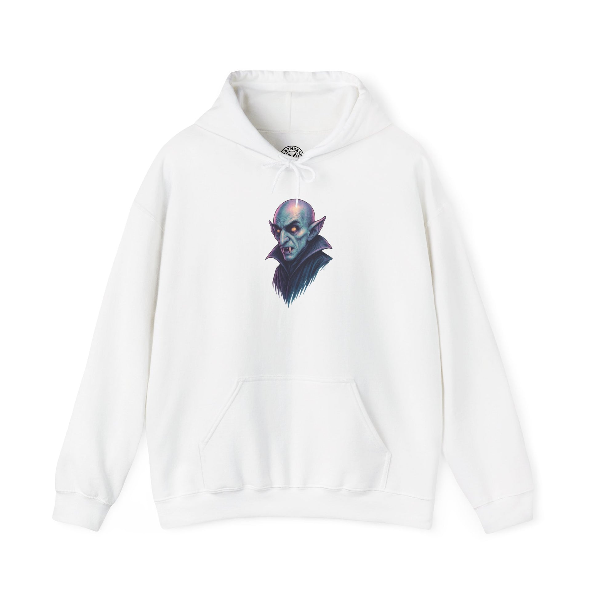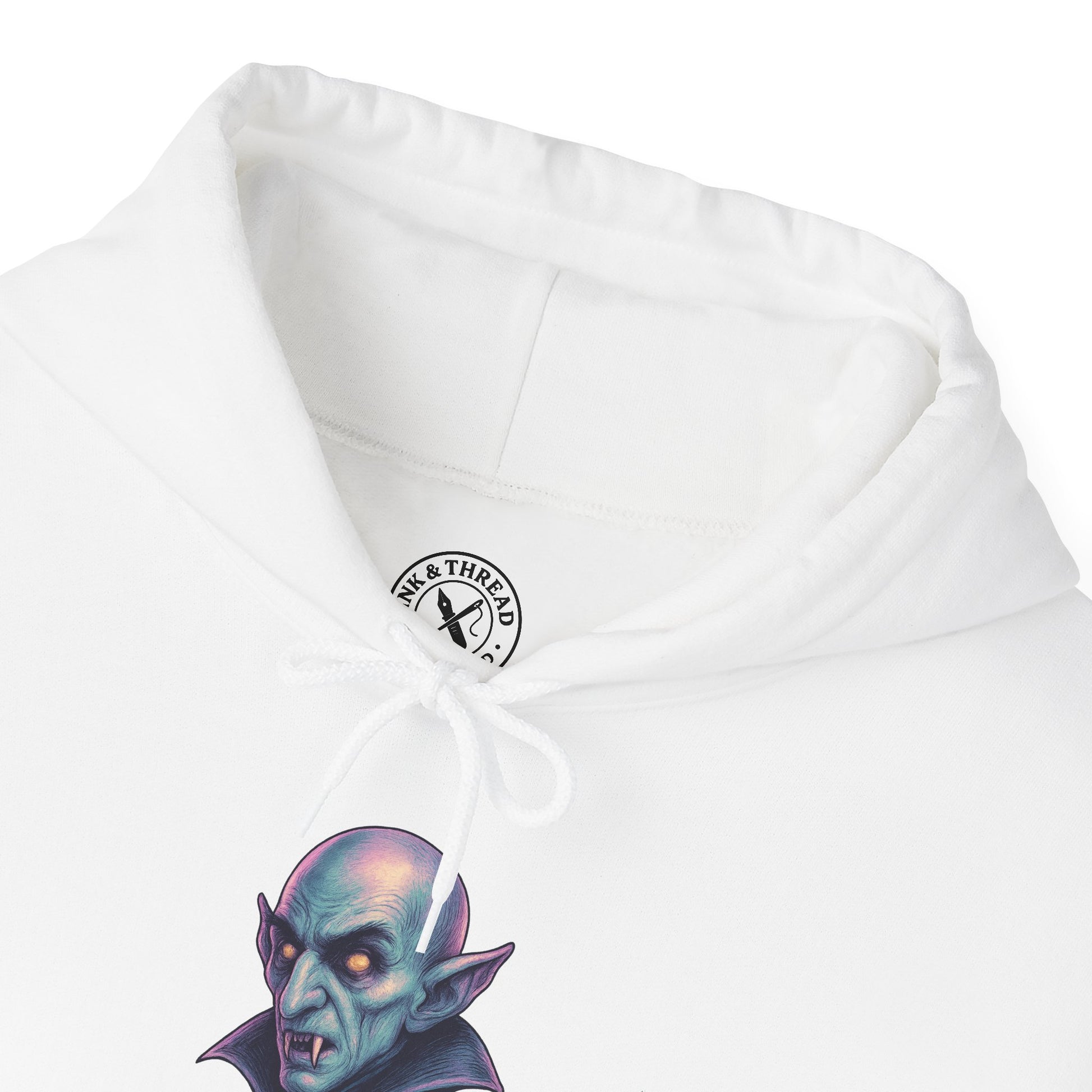 The Nosferatu Hoodie revives cinema’s most chilling figure — bald-headed, sharp-eared, and bathed in spectral light. His piercing yellow eyes and stark silhouette are rendered in Ink & Thread’s eerie pastel palette of ashen violet, moonlight blue, and faded bone, uniting gothic terror with modern artistry.