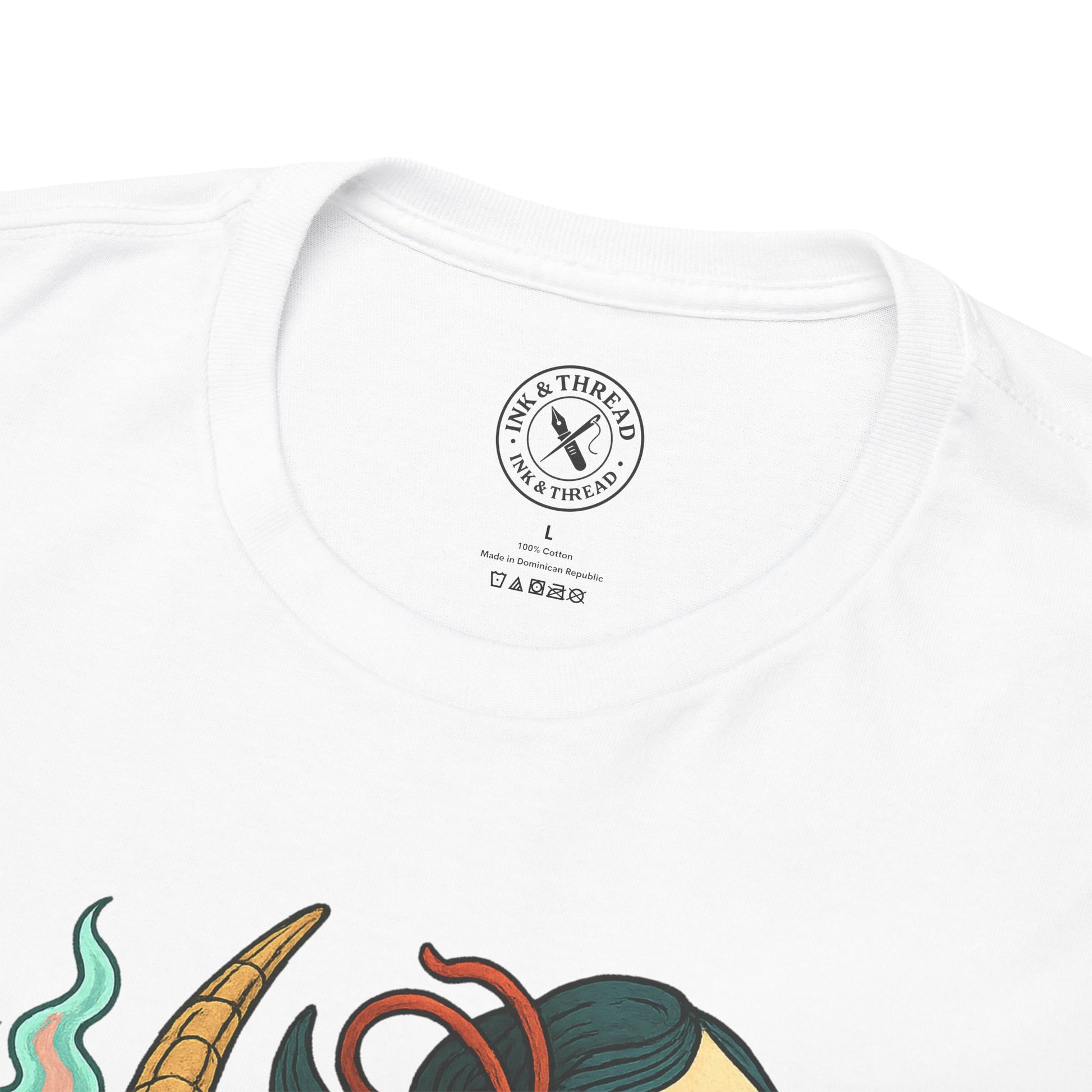 Rendered in bold pastel tones and intricate Japanese tattoo-style linework, this piece merges grace with danger — the beauty of summoning power far older than the one who dares call it.