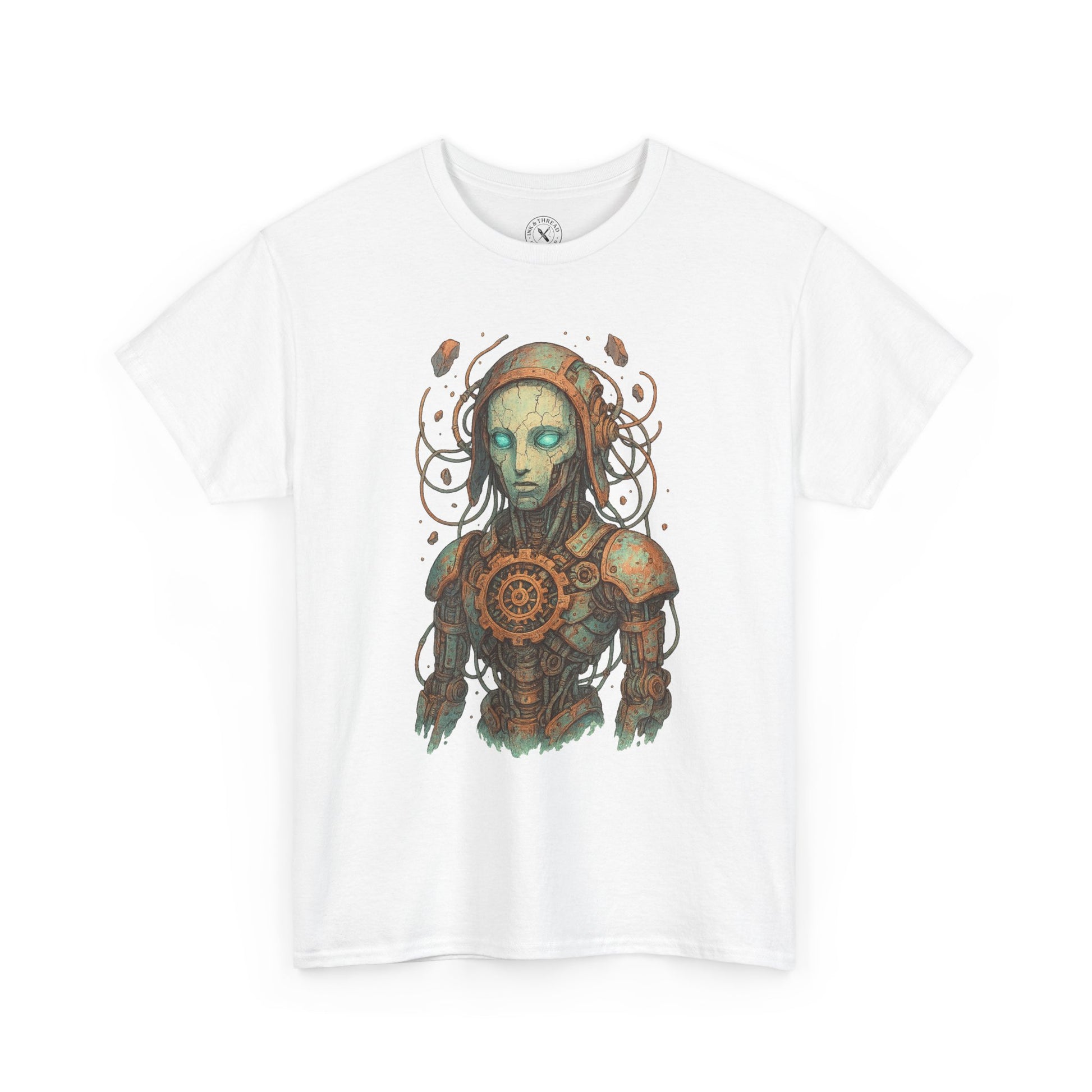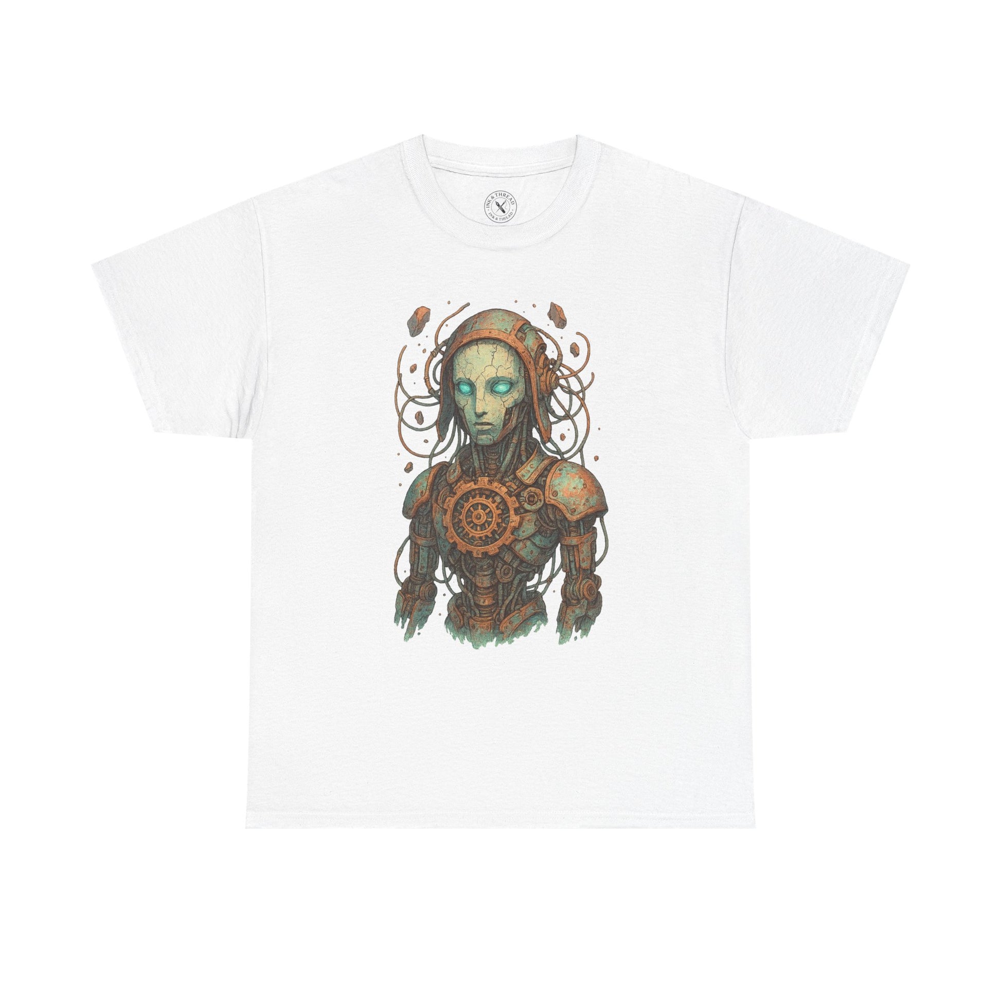 Rendered in decayed copper tones and pastel glows, this design balances fragility and power — a prophet assembled in the age before memory.
