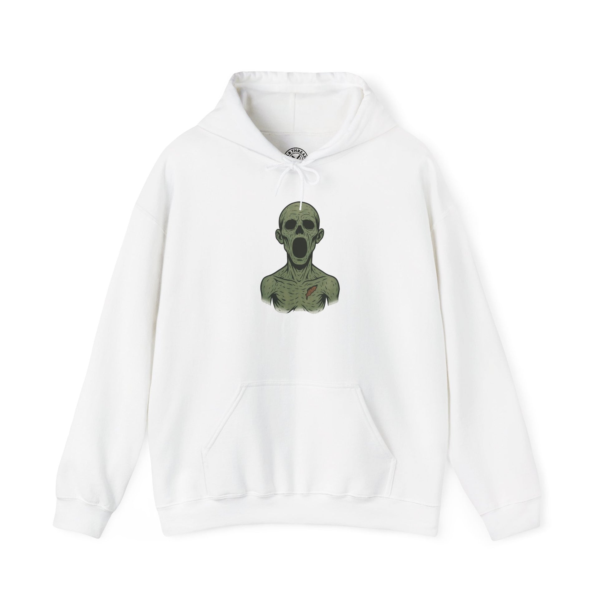 Pale Maw embodies raw, undead intensity — a corpse locked in a mid-scream expression, its jaw stretched wide into a hollow, endless maw. The sunken eyes, gaunt skeletal features, and sharp ink shadows give this design a brutal, chilling presence that hits hard on a hoodie.