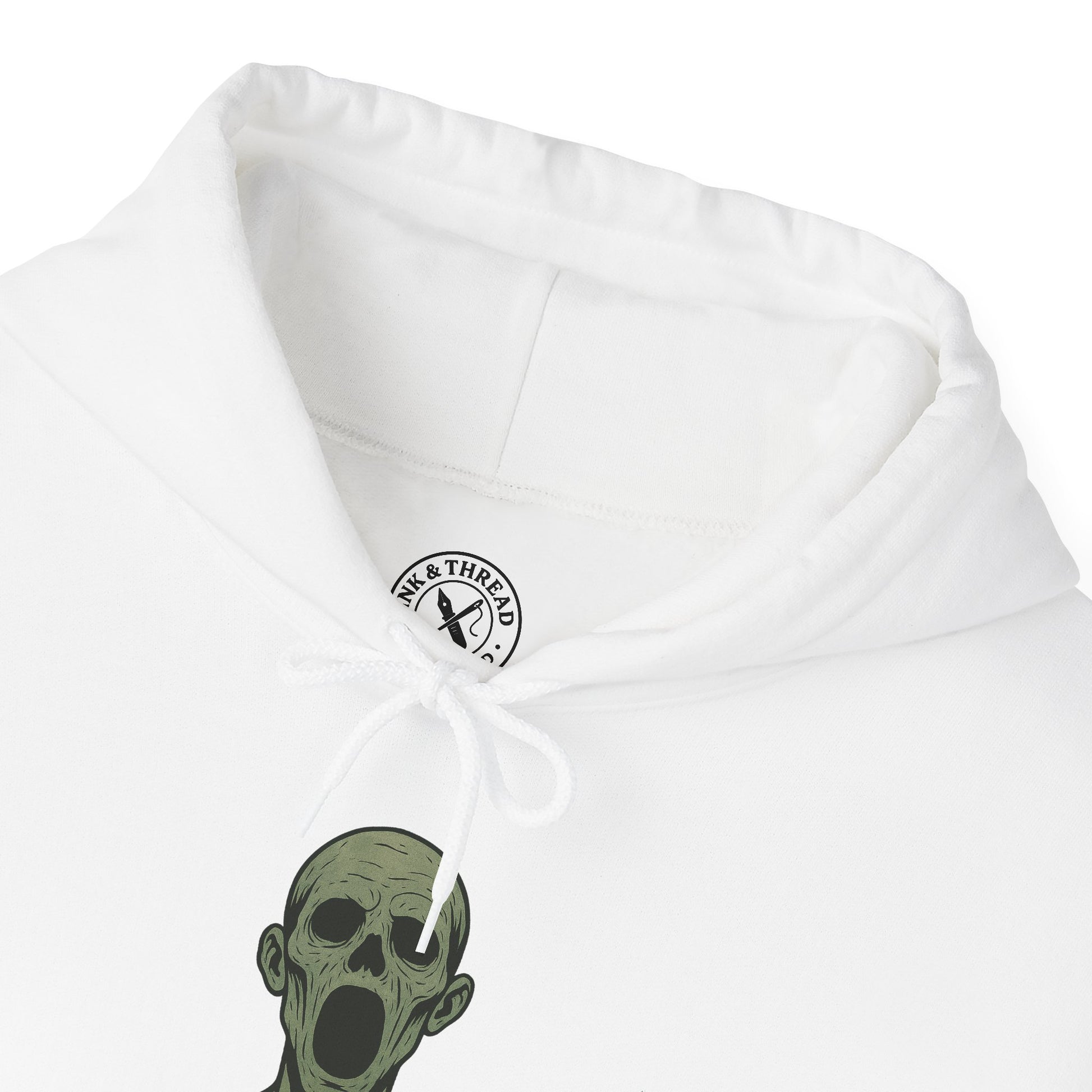 Rendered in your signature Ink & Thread pastel-ink style, Pale Maw uses muted corpse greens, clean black outlines, and subtle textured shading to maintain that crisp, graphic-novel silhouette. The wide-open mouth becomes the centrepiece — loud, haunting, and instantly recognisable on heavy hoodie fabric.