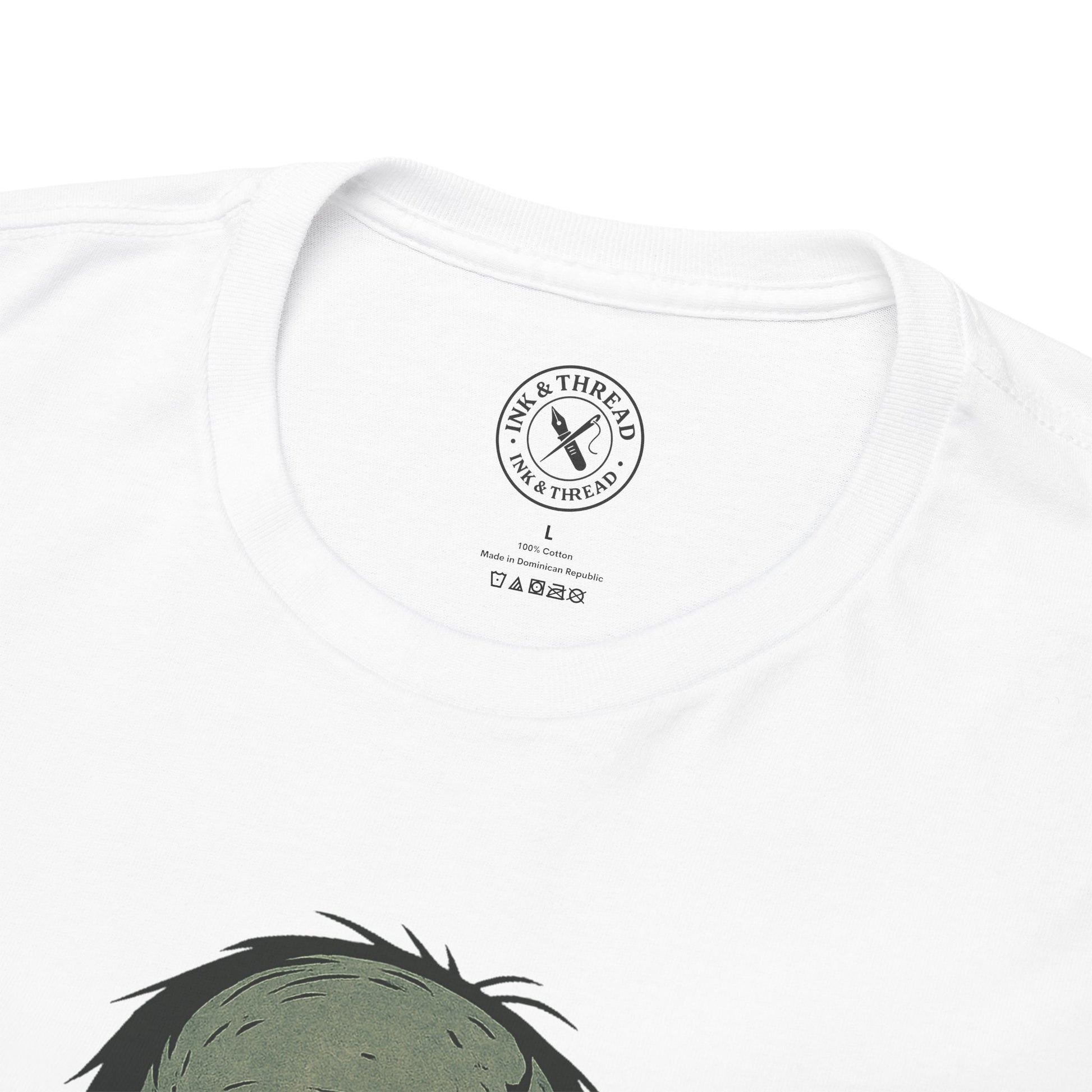 Drawn in the signature Ink & Thread pastel-ink style, Rotling uses bold black outlines, muted corpse tones, and subtle shading to create a clean, unsettling silhouette that prints beautifully on apparel. The hollow eyes and softened expression give this design a tragic, almost sympathetic presence — perfect for fans of atmospheric horror and minimalist undead art.