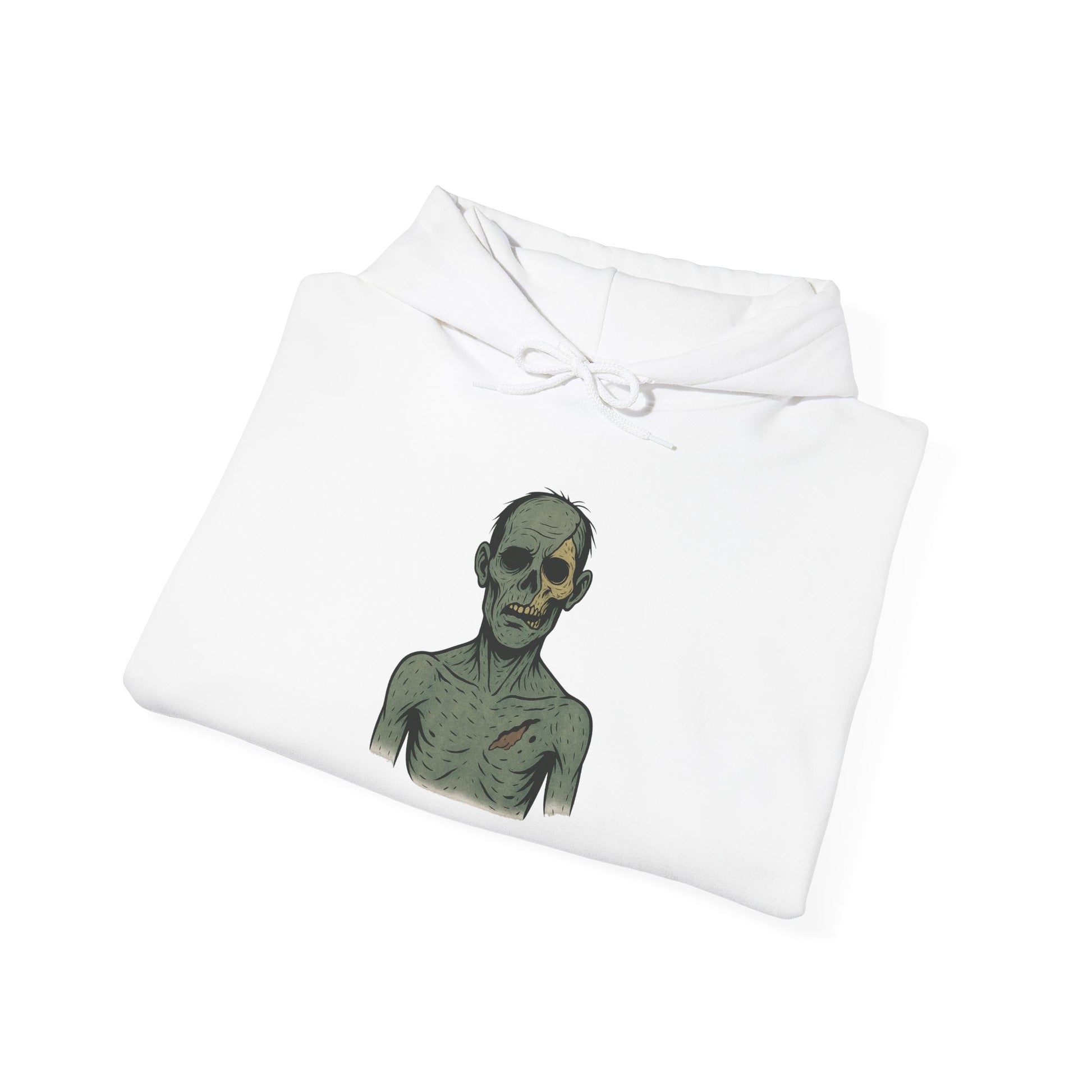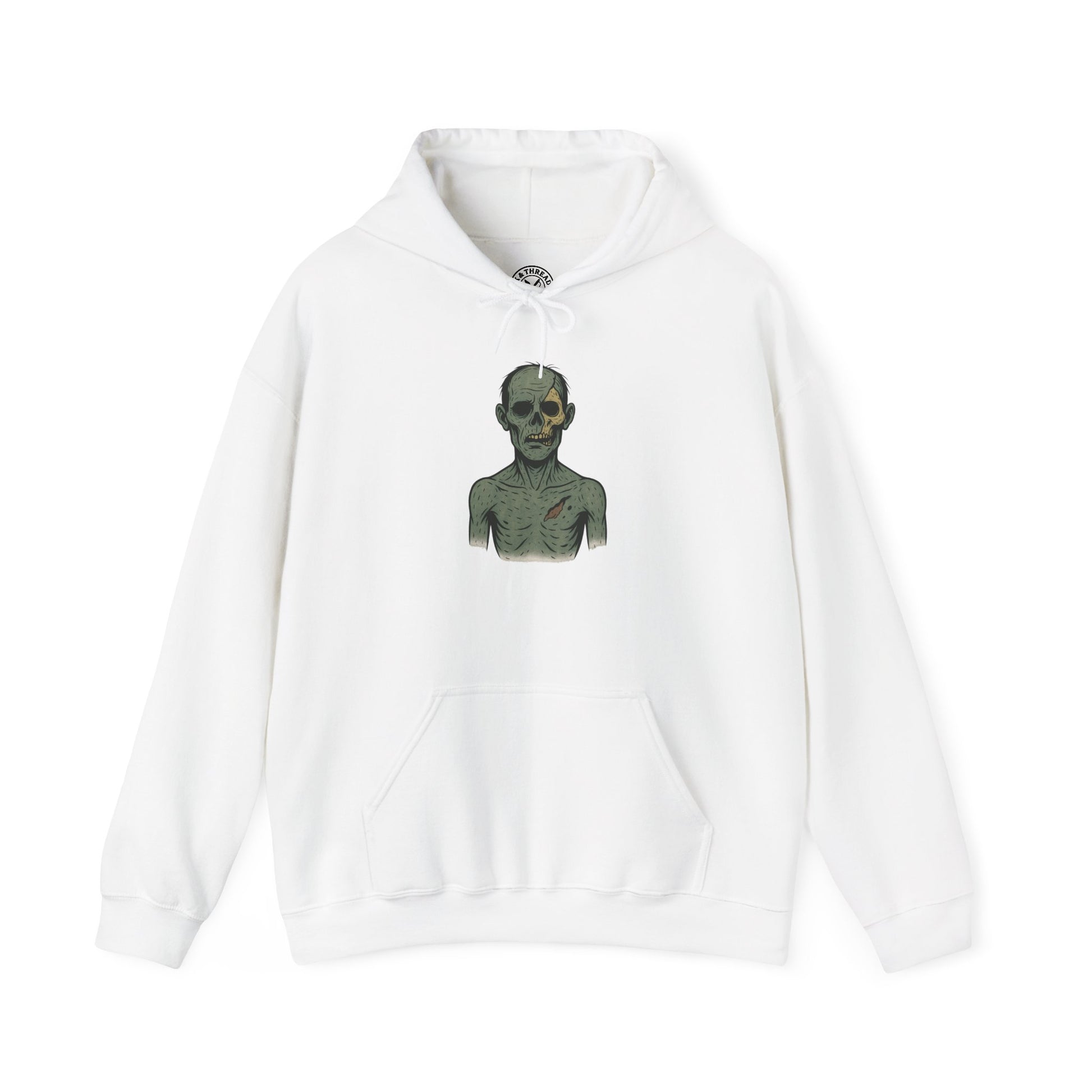 Rendered in the signature Ink & Thread pastel-ink style, this hoodie artwork uses bold black outlines, muted corpse tones, and subtle shading to create a clean but deeply unsettling silhouette. The hollow eyes and softened, tragic expression give Rotling an almost sympathetic presence — perfect for fans of atmospheric horror and minimalist undead art.