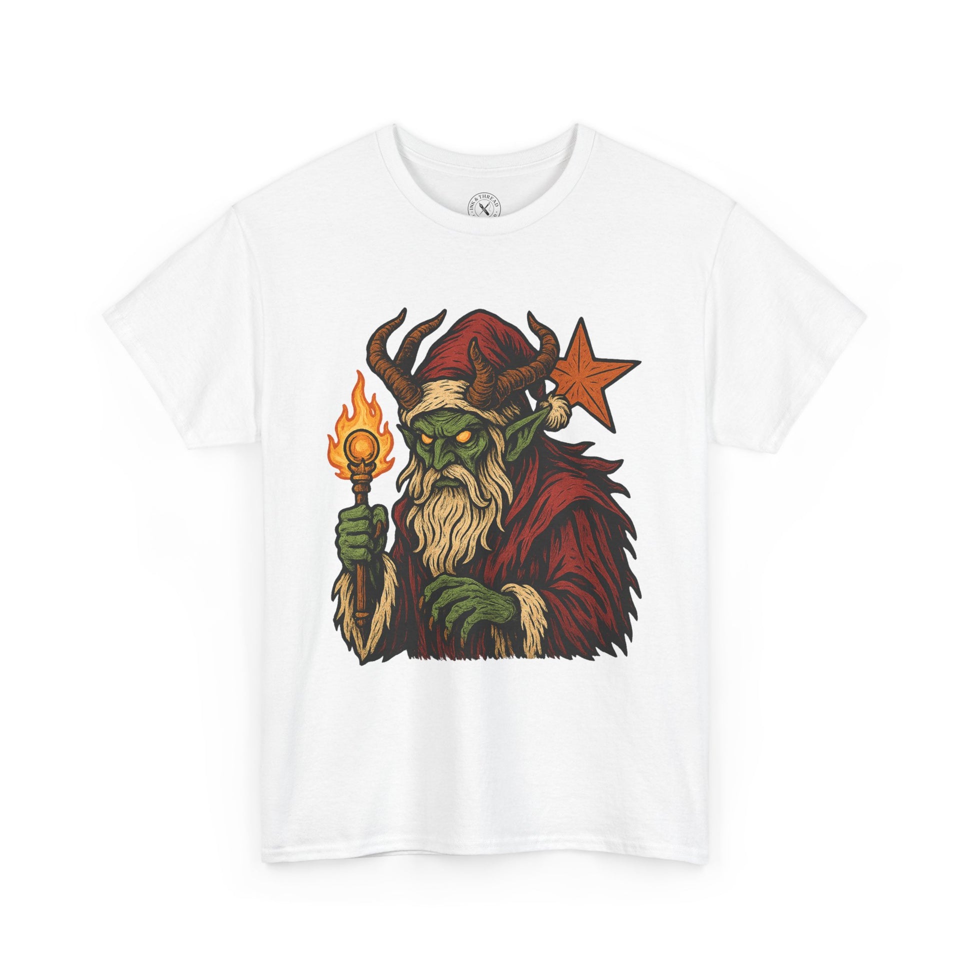 Saint Nefarious twists the image of old Saint Nick into a horned, corrupted winter warlock. With sickly green skin, blazing golden eyes, and a ragged crimson cloak lined in frostbitten fur, he carries a fiery staff that burns with cursed Yuletide magic. Bold ink shading, rich festive colours, and sinister details bring this dark holiday overlord to life — a perfect villain for your Christmas chaos.