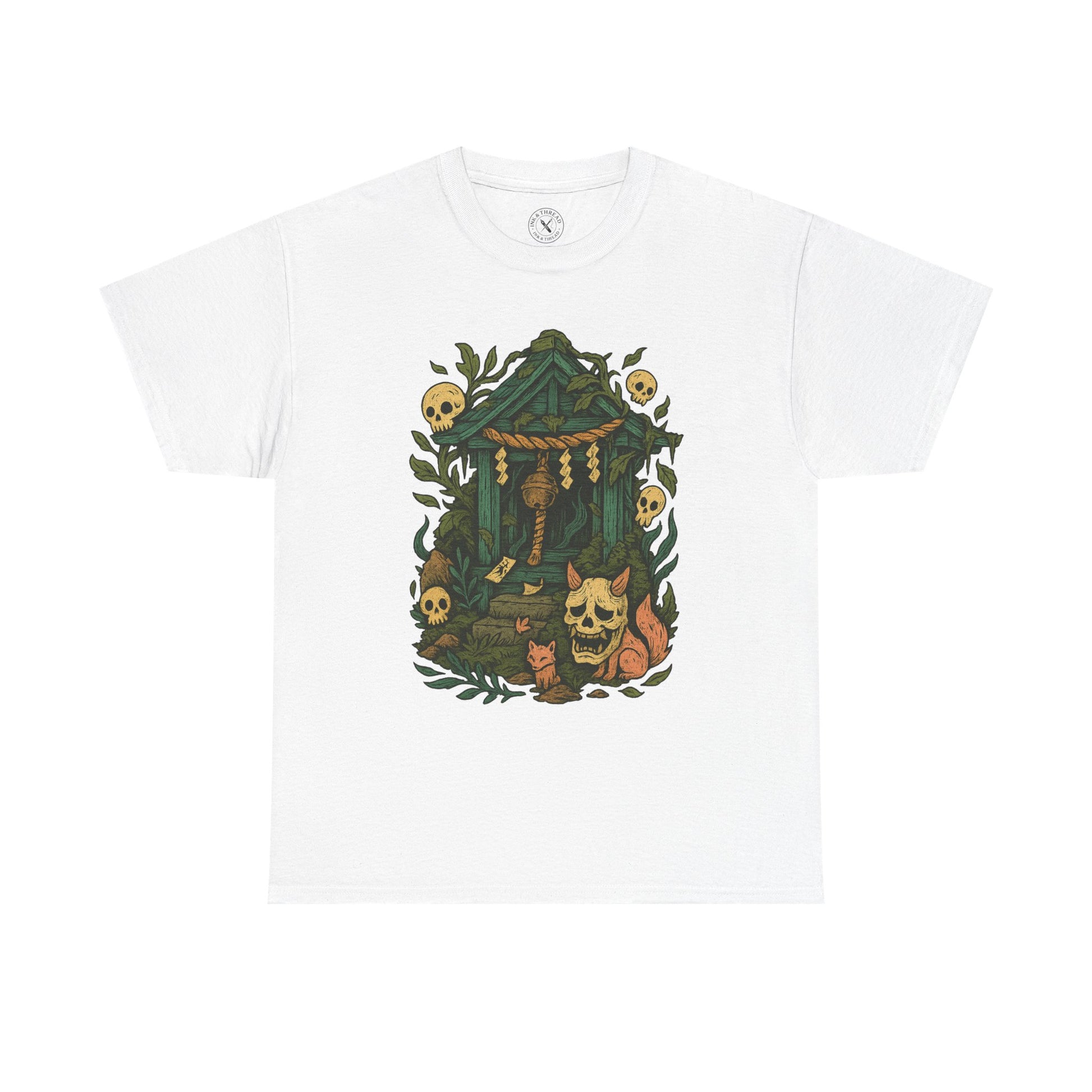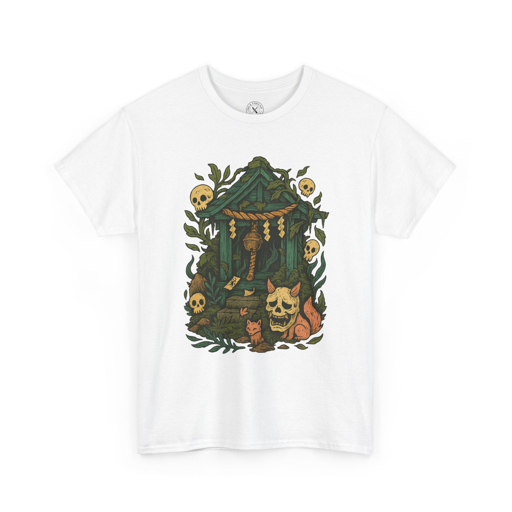 Shrine of the Forgotten reveals a crumbling Shinto shrine buried in moss and shadow. Its sacred rope hangs loose, its offering bell rusted — and its halls haunted by floating skulls and a small fox spirit that keeps silent watch.