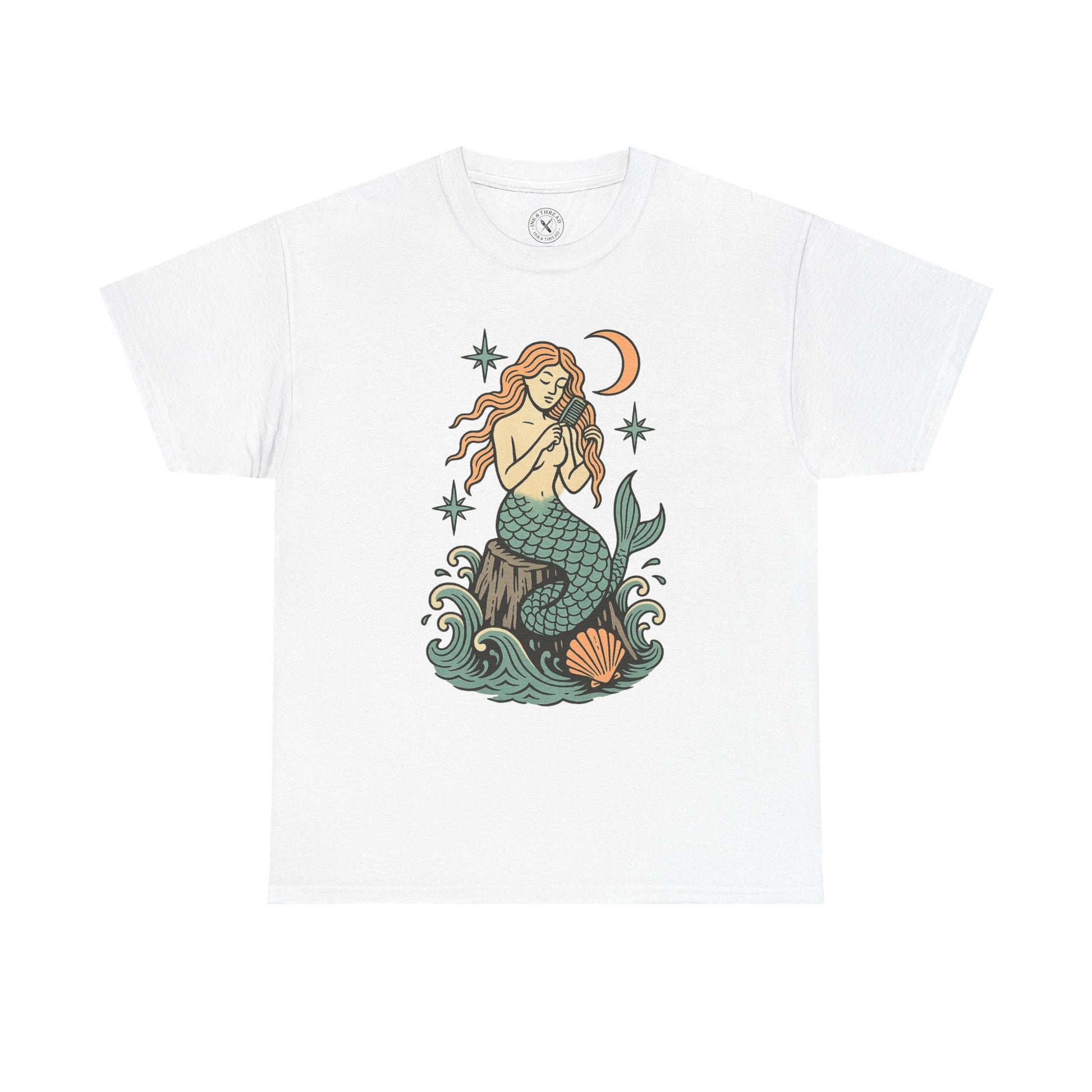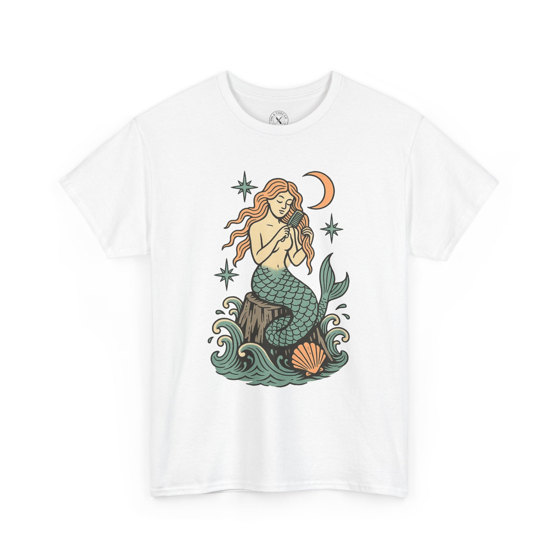 Answer the ocean’s whisper with Siren’s Call – a dreamy mermaid design inspired by vintage tattoo flash and seafarer myth. Perched on a rock amid swirling waves, this hand-drawn siren combs her flowing hair beneath a crescent moon and starlit sky. Soft pastel inks meet bold outlines for a piece that’s equal parts haunting and serene – perfect for lovers of the sea, inked beauty, and oceanic folklore.