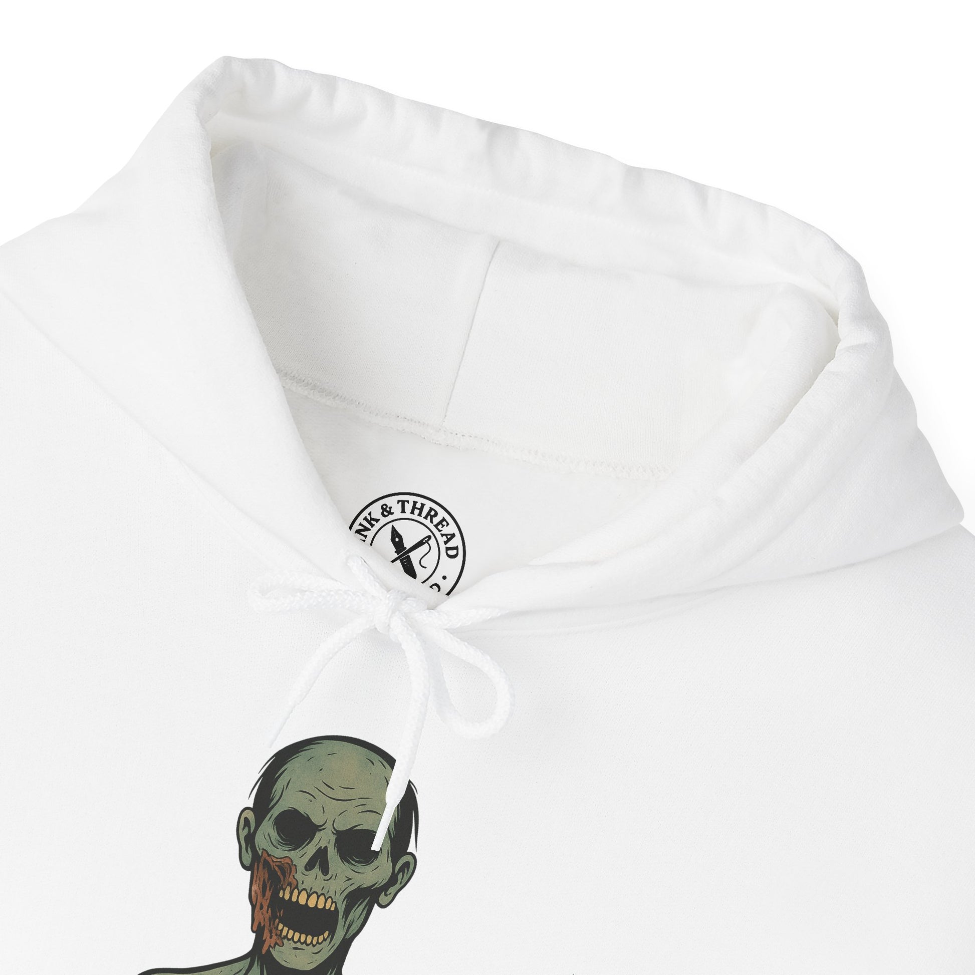 Rendered in the signature Ink & Thread pastel-ink undead style, Soft Rot Hoodie blends muted corpse greens, warm rot browns, and bold black outlines to achieve a crisp, print-ready finish. The softened melt-rot effect sets this design apart — more organic, more eerie, almost wax-like — making it a standout in the Zombie Collection.