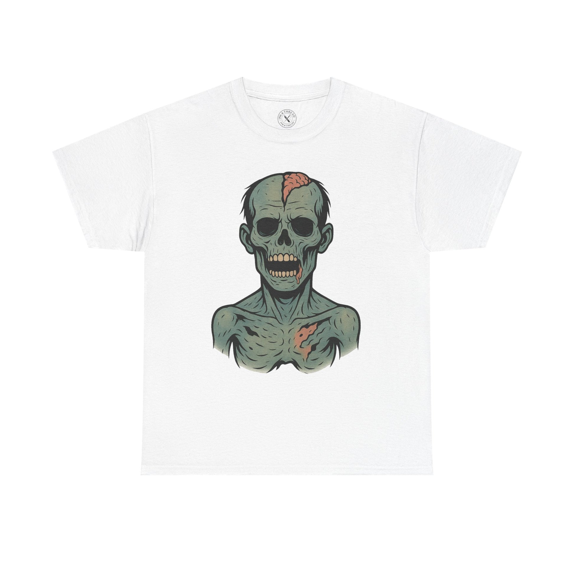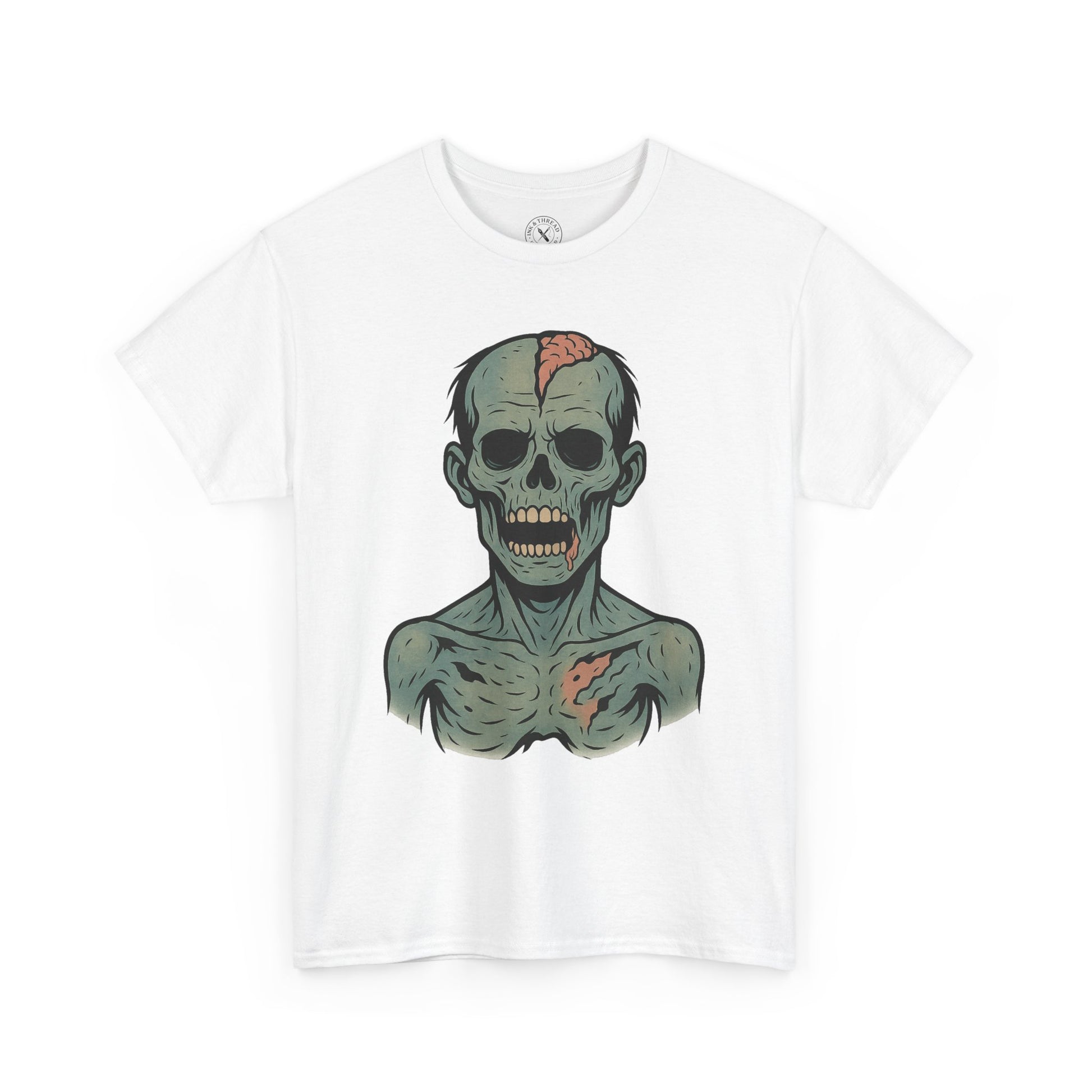 Split-Skull tears open the undead in bold, graphic detail. A jagged fracture splits the crown of the skull, revealing exposed brain matter beneath pale, rotted skin. Rendered in the signature Ink & Thread ink-tattoo style, this piece blends sharp black linework with muted pastel decay, creating a striking and brutal centrepiece for any horror-lover’s wardrobe.