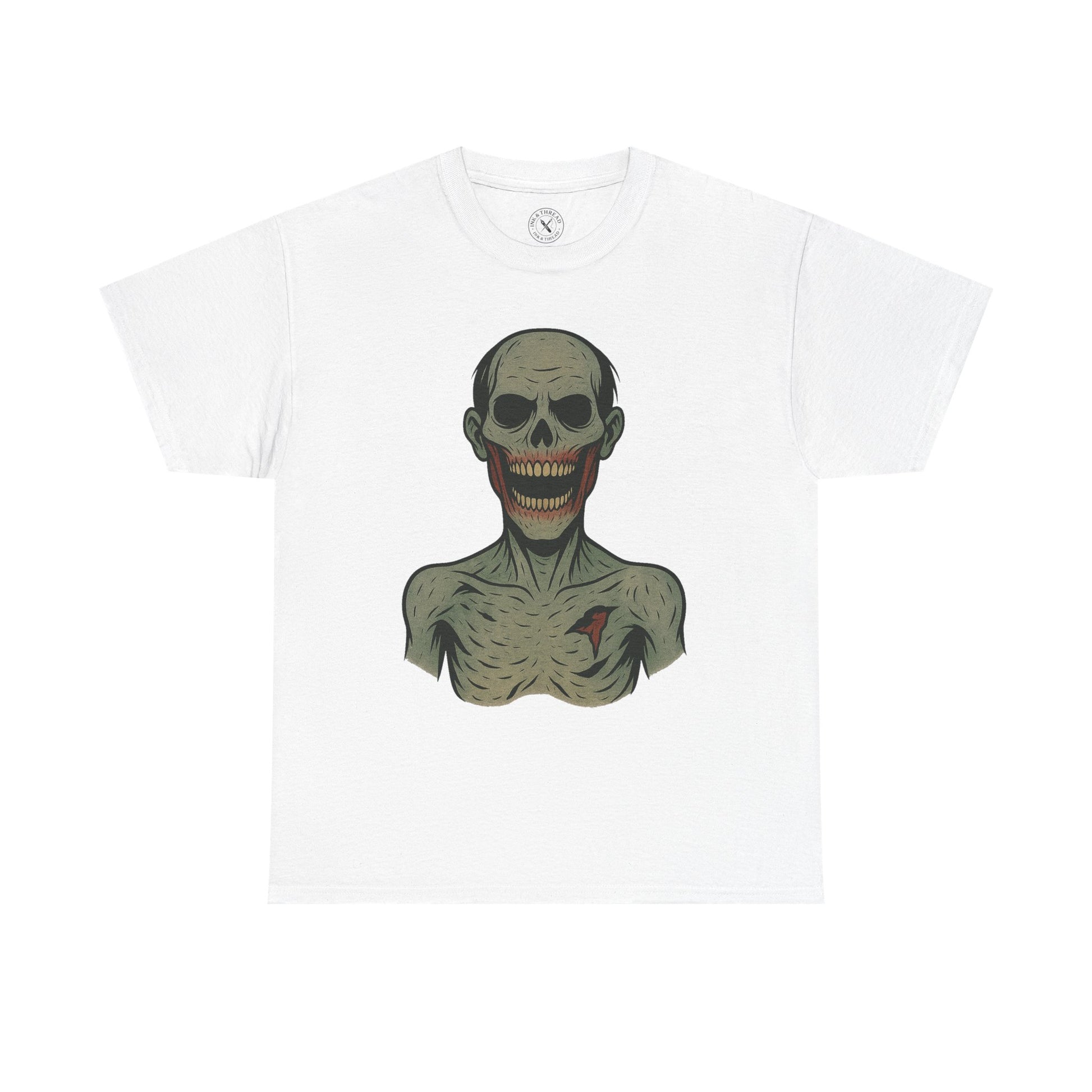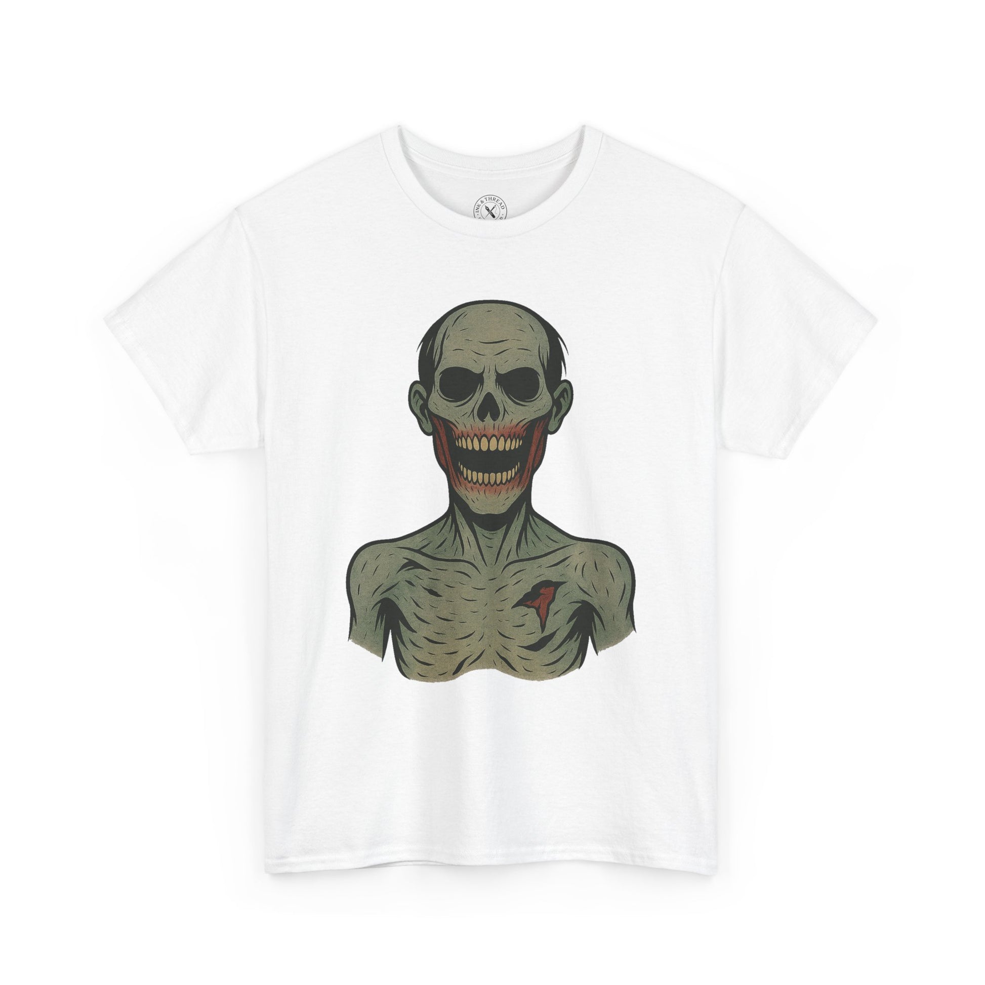 Drawn in the signature Ink & Thread pastel-ink style, Tattered Grin combines bold black outlines, muted corpse tones, and subtle decay details for a clean, print-ready finish. The exaggerated grin gives this design a distinct silhouette that stands out across the entire Zombie Collection.