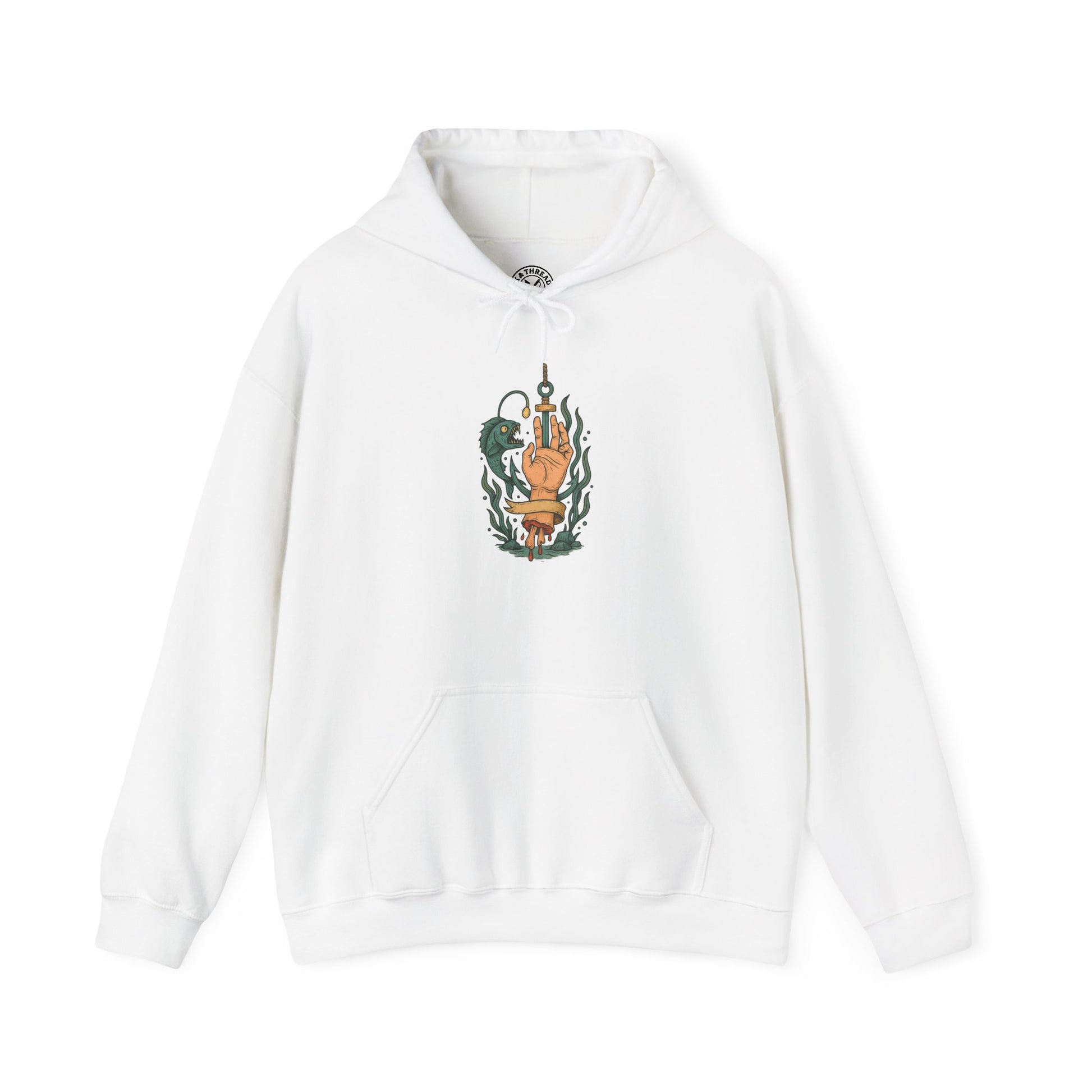 The Bait Hoodie embodies a chilling blend of myth and macabre — a severed hand pierced by a harpoon hook, drifting in eerie calm while a lurking sea creature coils close. Seaweed curls like whispered curses, while blood-red trails flow like ink, binding ocean danger with dark beauty.