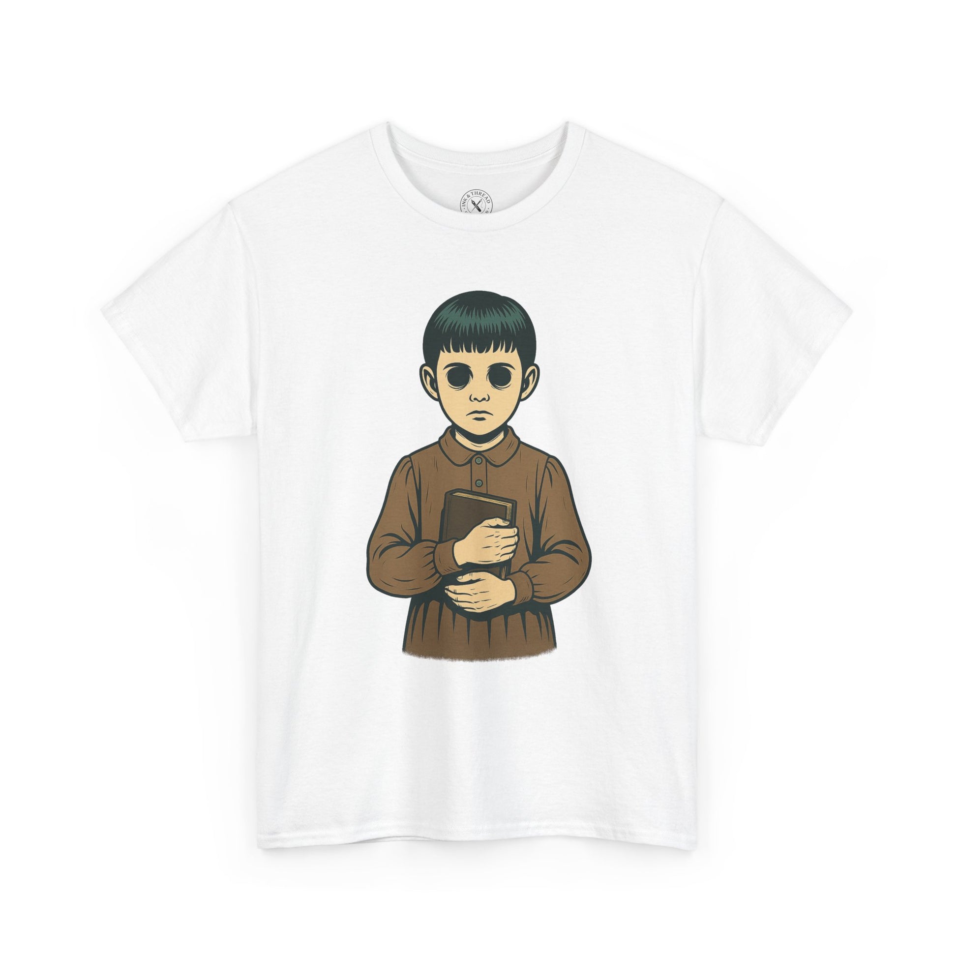 Some pages are never meant to be read. The Book T-Shirt depicts a surreal child with hollow, sunken eyes, clutching a closed leather-bound book with no title or markings. Dressed in old-fashioned Victorian clothing, the figure feels timeless and unsettling, adding one of the eeriest entries to The Hollow Ones collection.