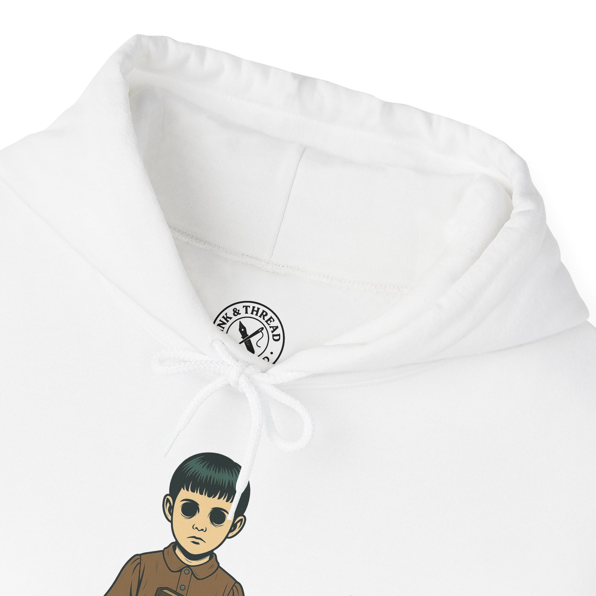 The Book Hoodie depicts a surreal child with hollow eyes and a calm, unreadable face — clutching a closed, leather-bound book with no title or markings. Their Victorian-style attire and quiet stillness blur the line between innocence and omen. The book may be blank… or perhaps it’s written only for those who shouldn’t see.