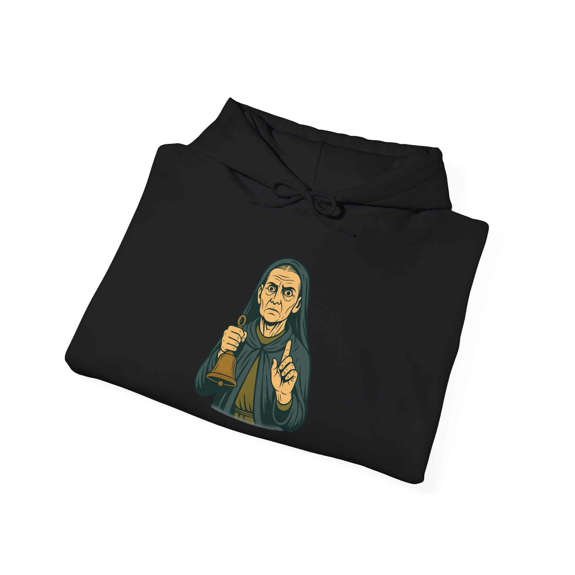 The Caller Hoodie introduces a hollow-eyed elder cloaked in deep shadow, raising a single finger in silent warning as she grips an old brass bell. Her expression is cold and fixed — a presence that feels more like an omen than a gesture, as if she’s alerting you to something only she can hear.