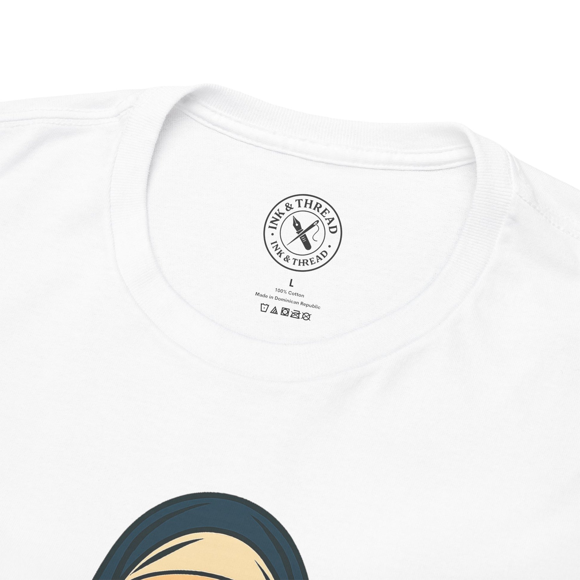 bold flat colors, crisp outlines, minimal shading, and a clean black hem for a sharp apparel-ready finish. The muted navy and gold palette adds to the unsettling religious tension, making this one of the most striking elder portraits in the collection.