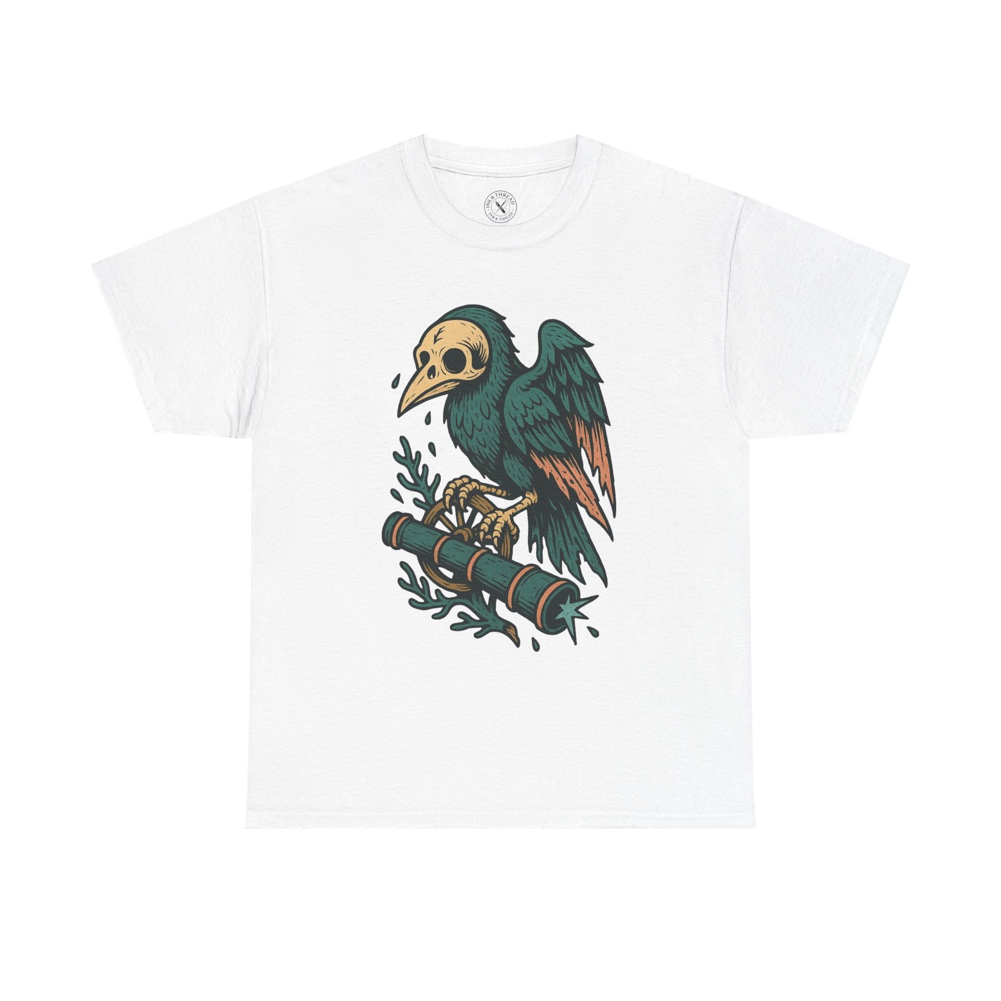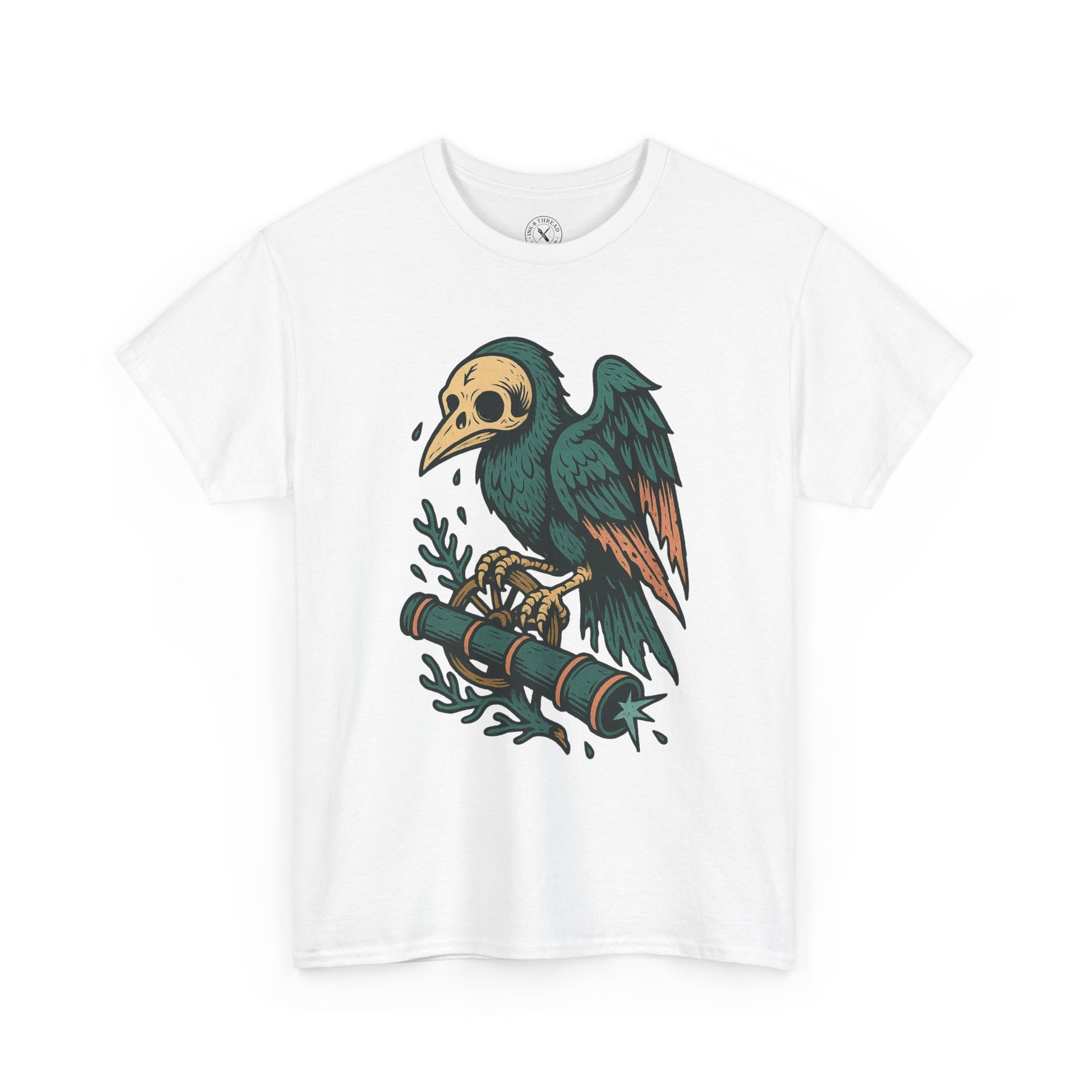 The Crow’s Curse captures the moment before misfortune strikes – a skeletal crow perched atop a weathered spyglass, its hollow eyes fixed on something far beyond. Wrapped in vintage tattoo linework and rendered in muted, moody pastels, the design evokes ghost stories, lost sailors, and the strange warnings written in feather and bone. A dark omen in wearable form.