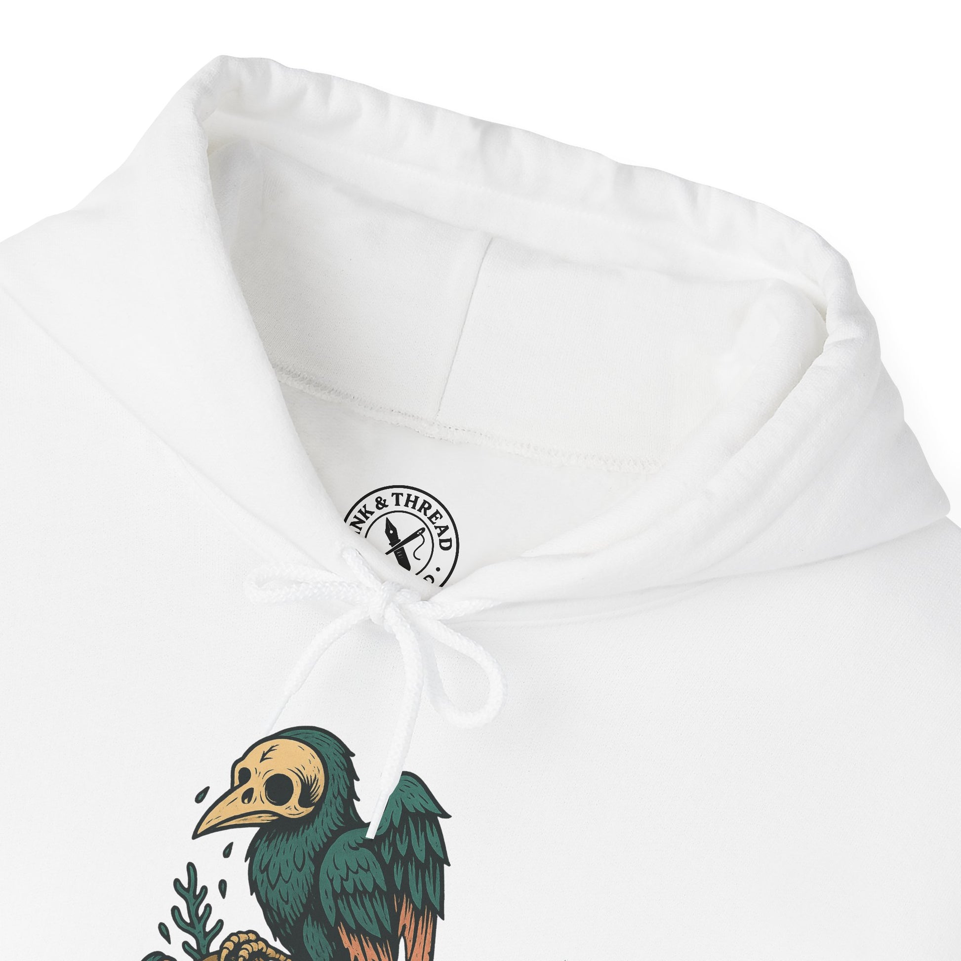 Crafted from ultra-soft, heavyweight fleece, the hoodie wraps its wearer in warmth and foreboding — perfect for those drawn to the strange beauty of omen and myth. The muted palette and intricate feather detailing evoke ghostly tales whispered by the tide.