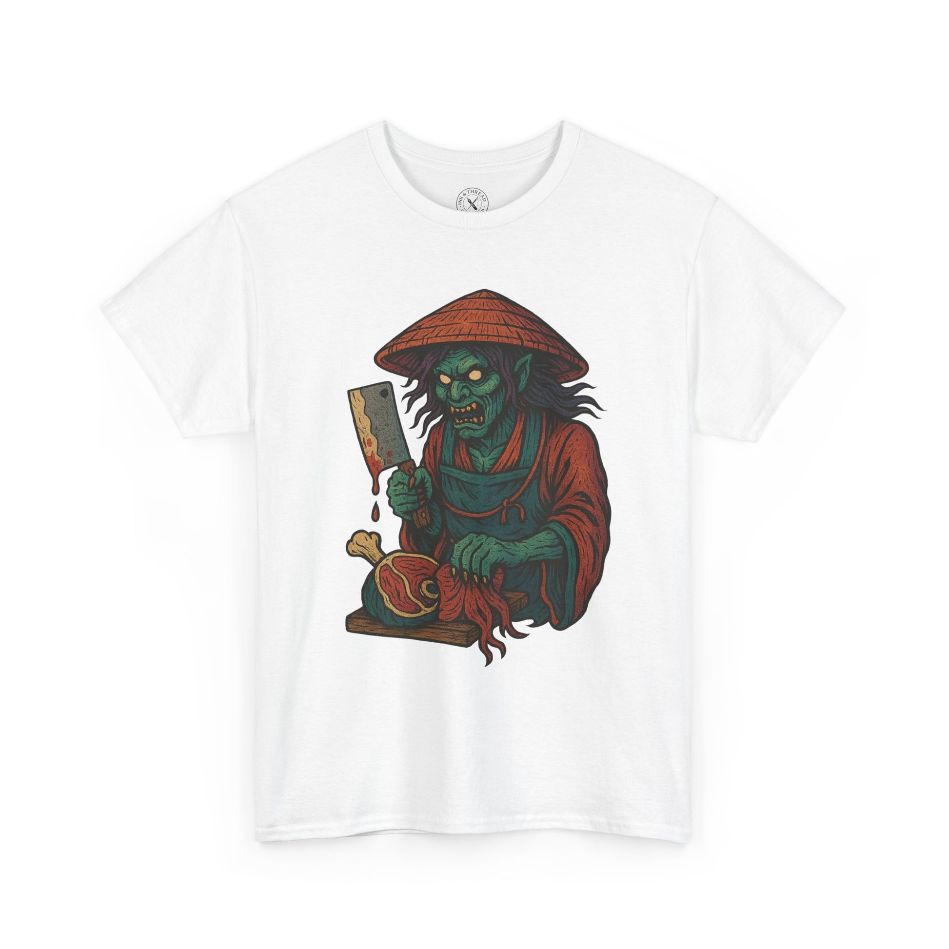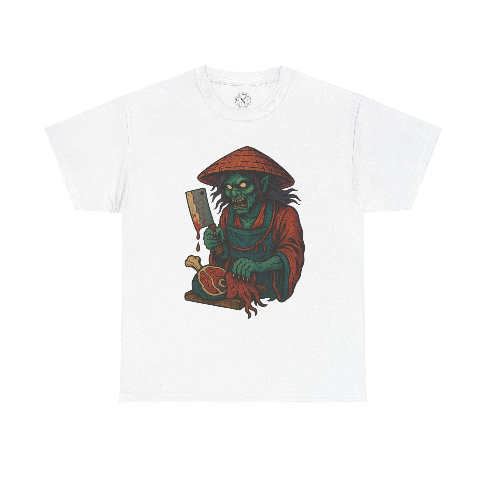 Rendered in intense Japanese tattoo linework and ghostly pastel hues, this design channels horror, myth, and the unrelenting hunger of a spirit long exiled from the cycle.