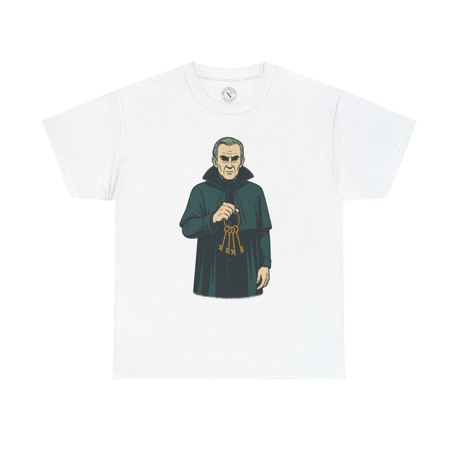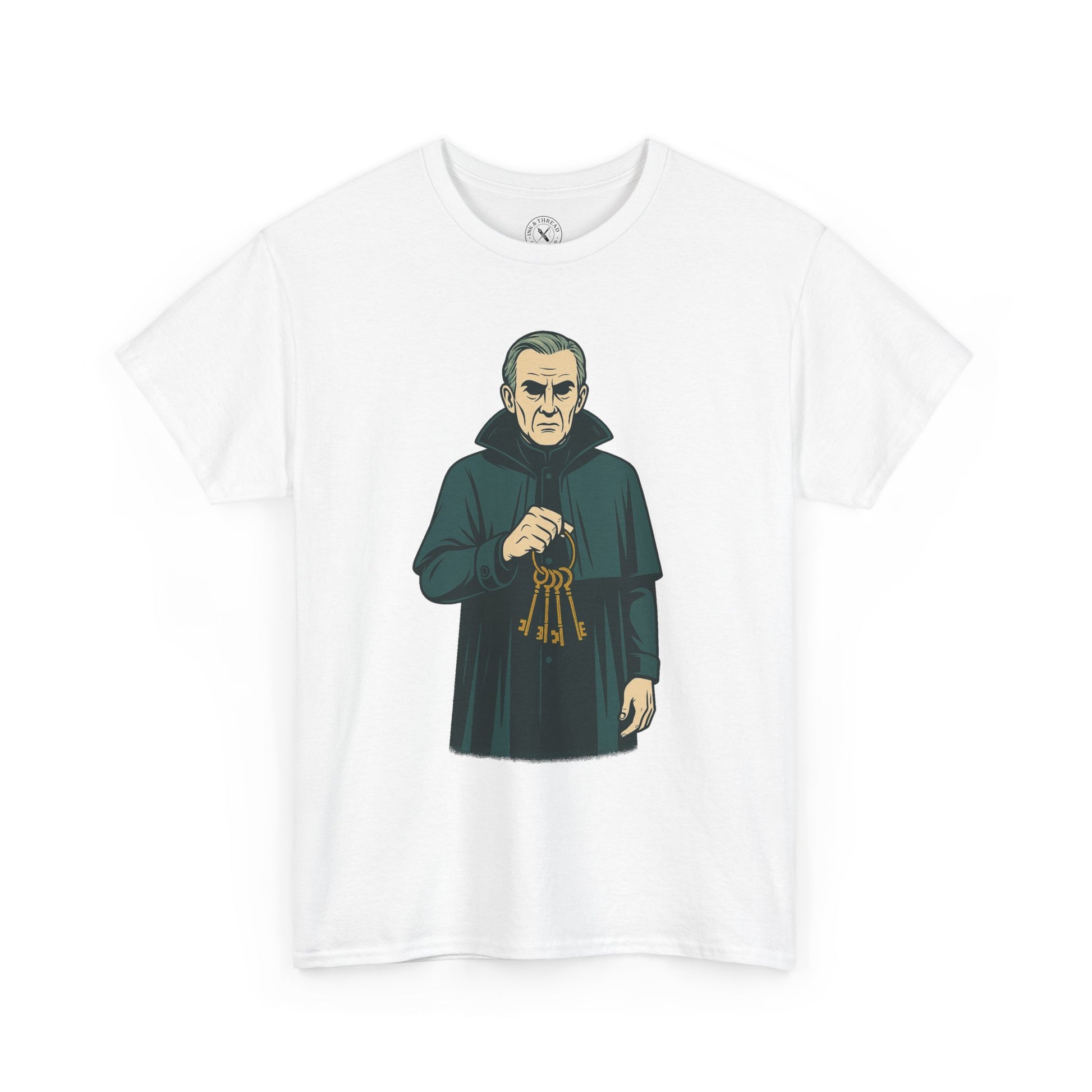 Some doors should never open. The Keeper T-Shirt introduces a surreal elderly man in a long Victorian cloak, pale skin, and hollow eyes. His hand grips a heavy ring of old iron keys, his expression stern and unreadable — the gatekeeper to secrets better left hidden.