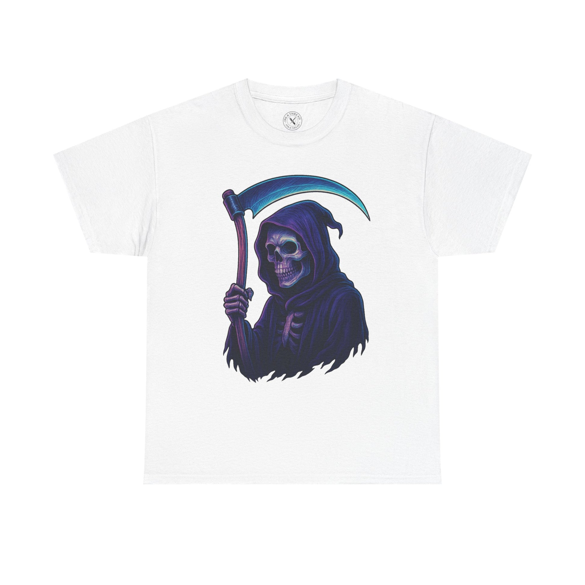 Death takes form in this haunting pastel masterpiece — The Grim Reaper. Cloaked in deep purples and teals, the skeletal figure grips his glowing scythe, every bone and fold rendered in chilling precision. Equal parts fear and beauty, this transparent-background design embodies Ink & Thread’s signature balance of classic horror and modern artistry. A must-have for any Halloween or gothic collection.