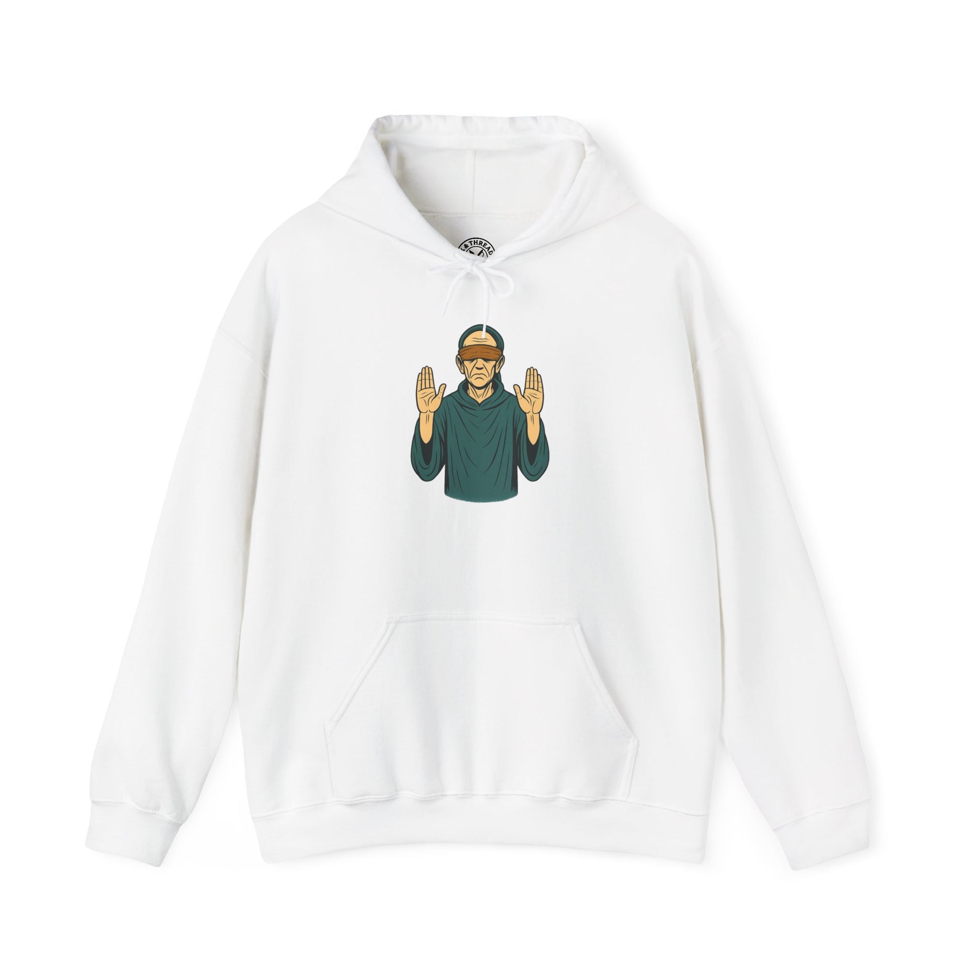 The Halted Hoodie presents a solemn, blindfolded elder frozen in a moment that sits somewhere between warning and prophecy. With both hands raised in eerie stillness, their gesture feels ritualistic — as if sensing a presence, a danger, or a truth the rest of us are unable to see. Their expression is unreadable, calm yet impossibly tense, amplifying the unsettling aura that defines The Hollow Ones universe.