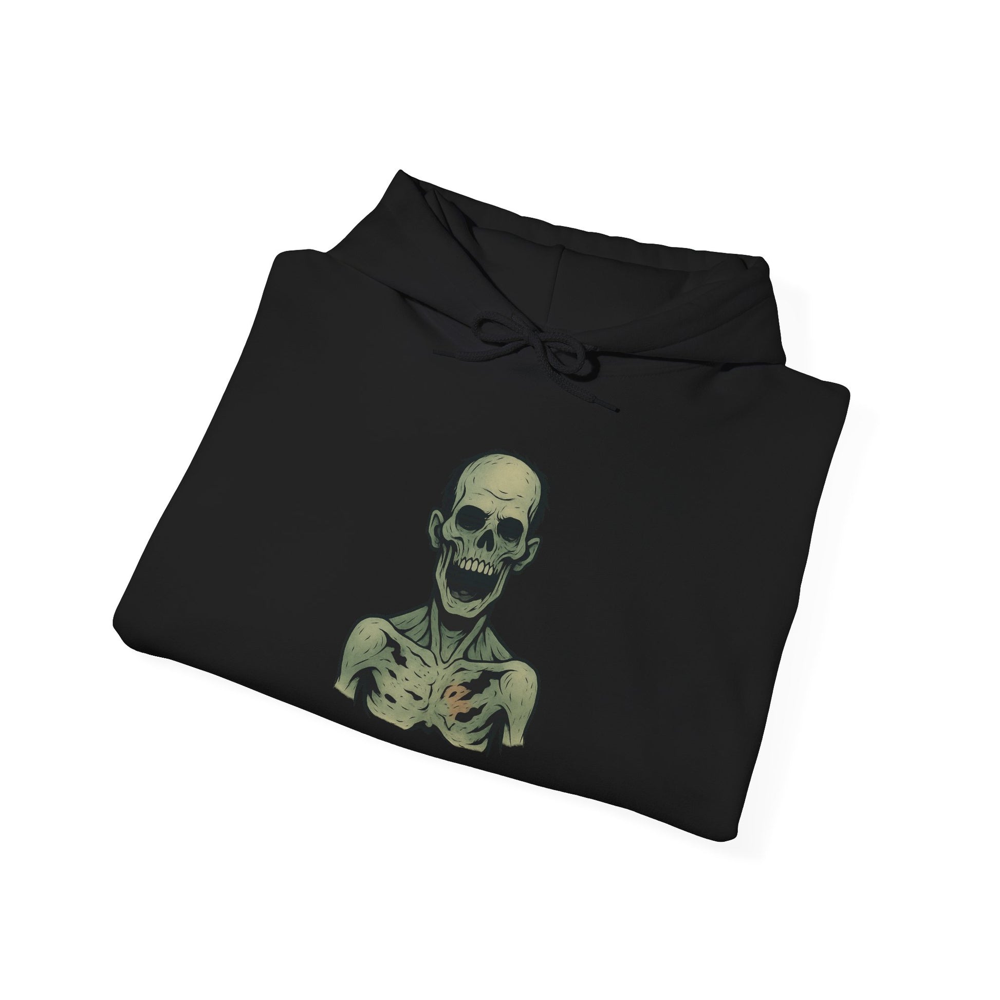 The Hollow-Jaw Hoodie unleashes pure undead brutality — a skeletal terror with its lower jaw torn away, leaving only a blackened void and a silent, endless scream. Rendered in the signature Ink & Thread ink-tattoo style, this print uses sharp black outlines, muted corpse-greens, and soft pastel rot to create a bold, horror-clean aesthetic that stands out on cosy, heavyweight fabric.