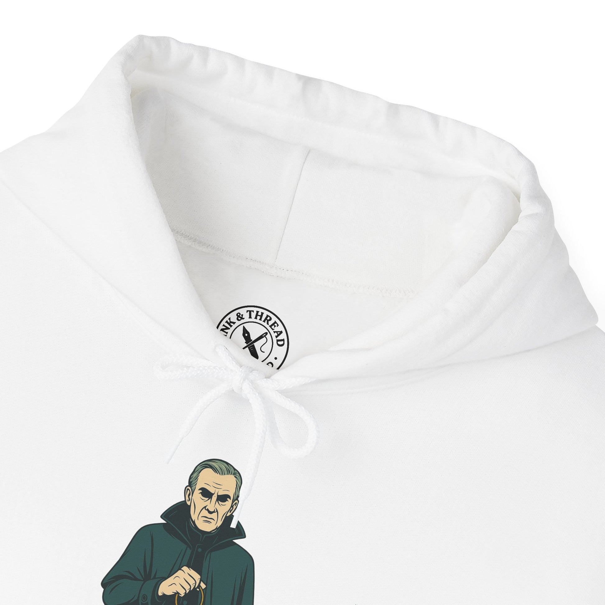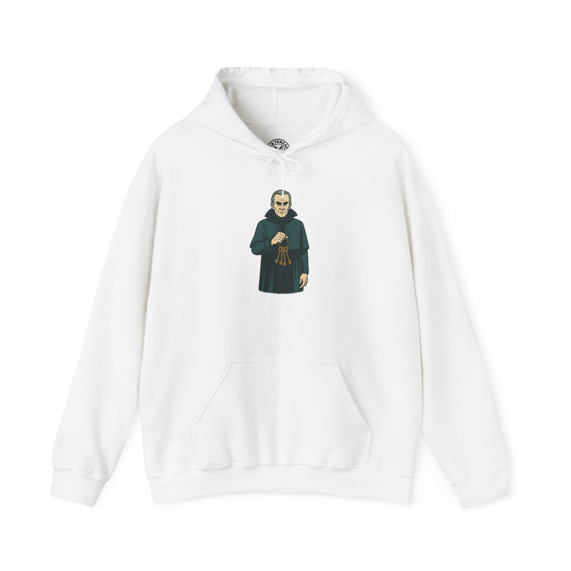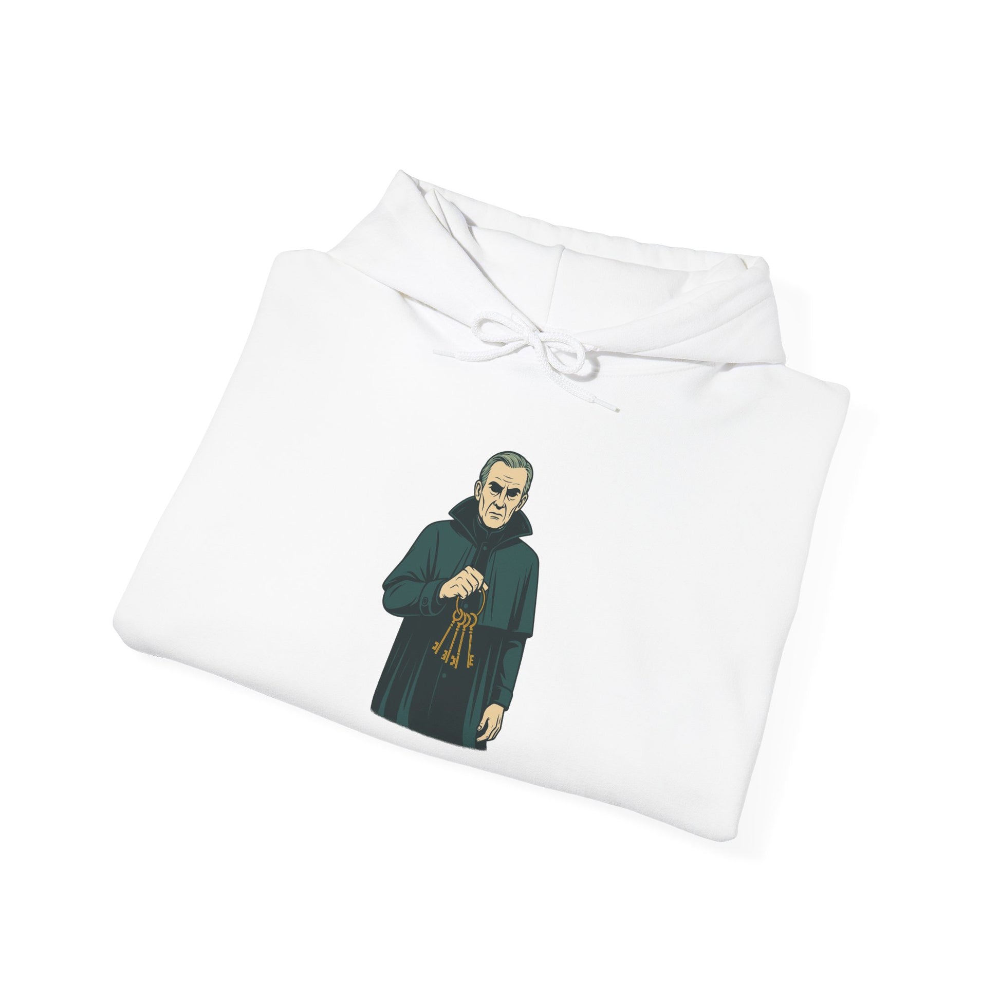 The Keeper Hoodie introduces a surreal elderly man wrapped in a long Victorian cloak, his hollow eyes hidden beneath shadow. A ring of ancient iron keys hangs from his hand — their purpose unknown, their weight unmistakable. His expression is unreadable, caught between wisdom and warning, the silent guardian of what must remain locked.