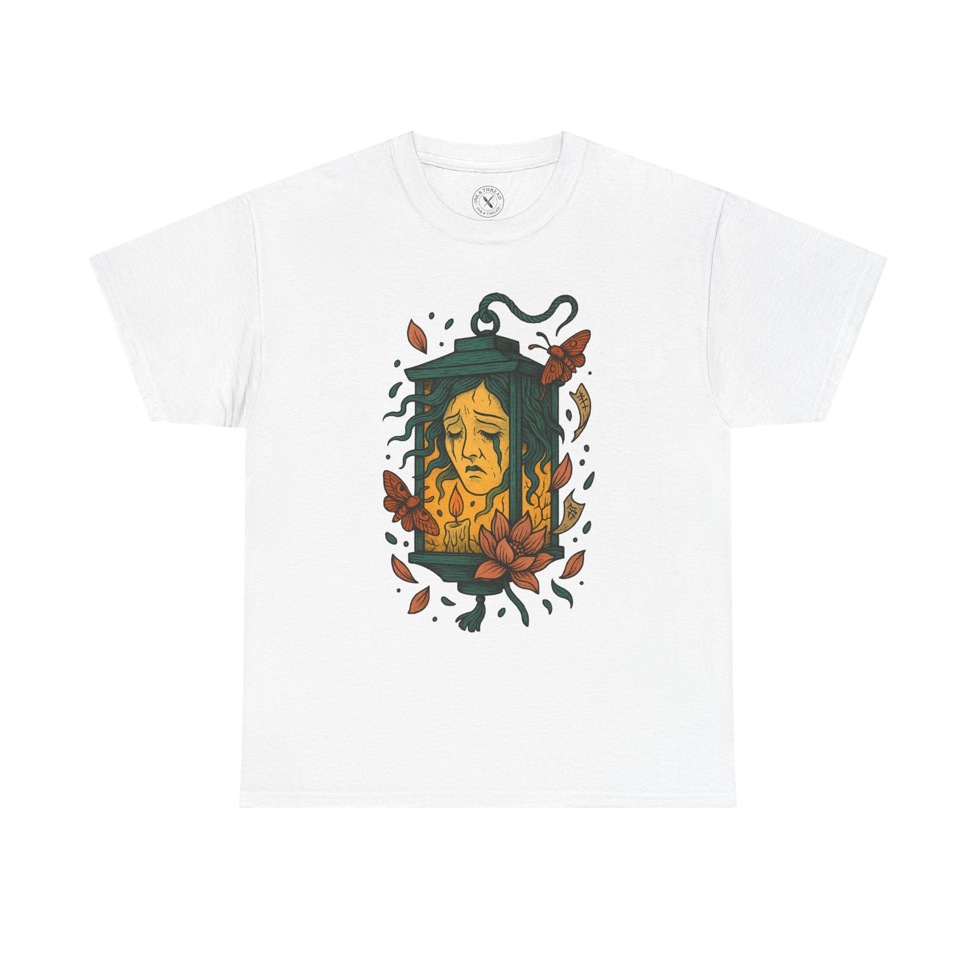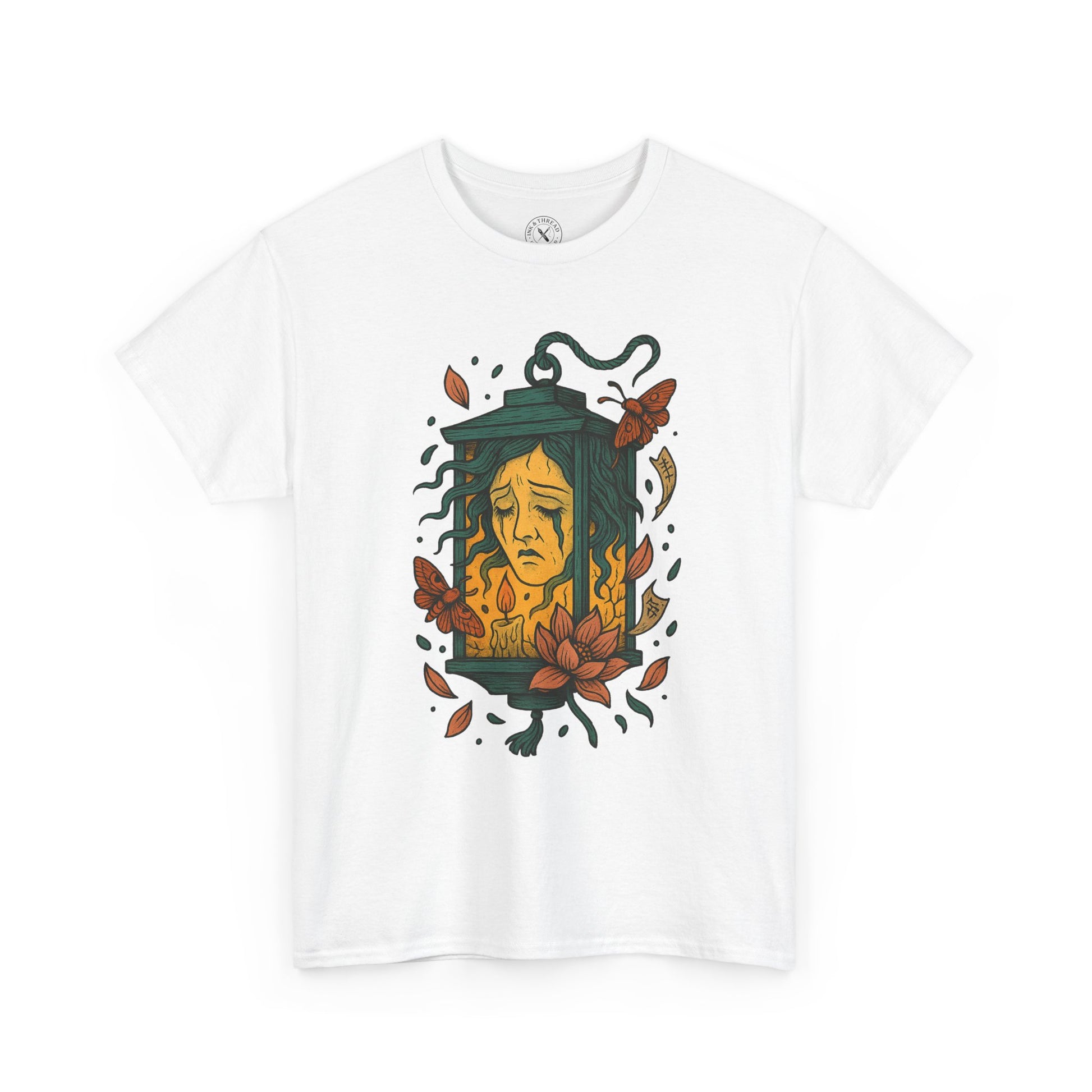 This delicate design blends Japanese folklore with rich tattoo artistry: tear-streaked eyes, tendrils of hair floating like smoke, and warm candlelight flickering inside her prison. Lotus petals, old seals, and nighttime moths swirl around the frame.
