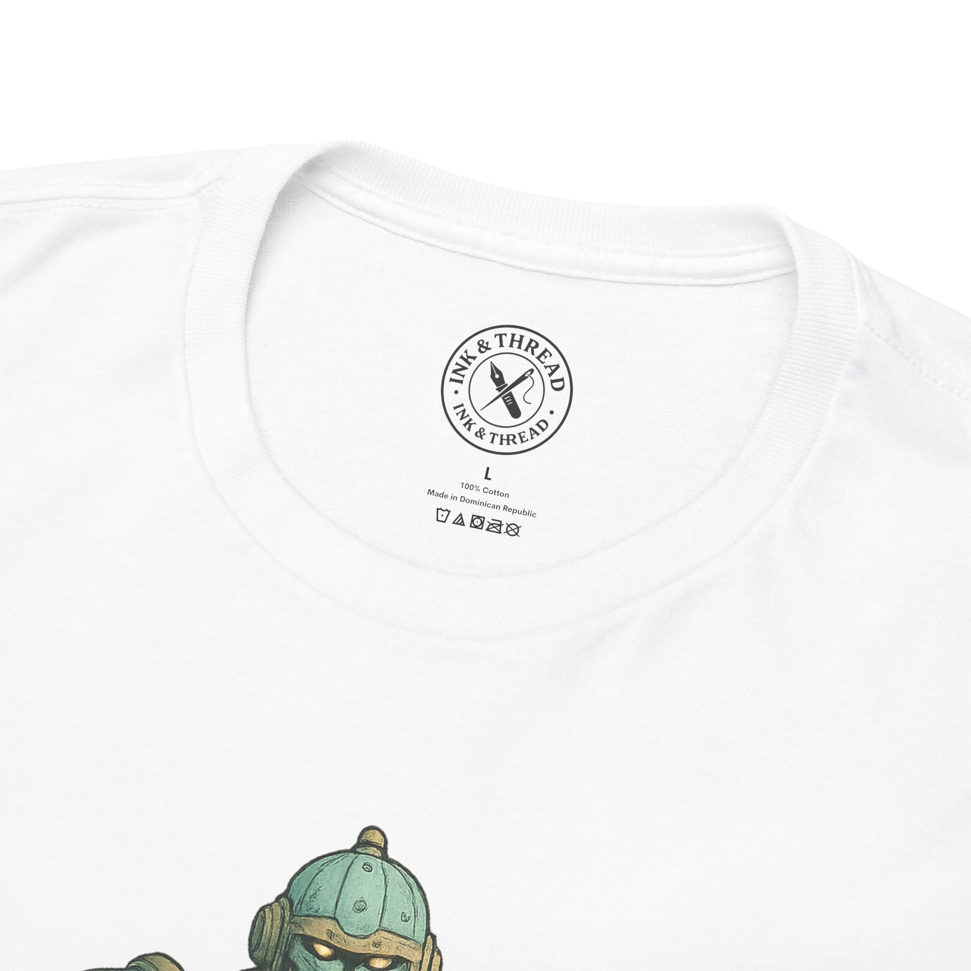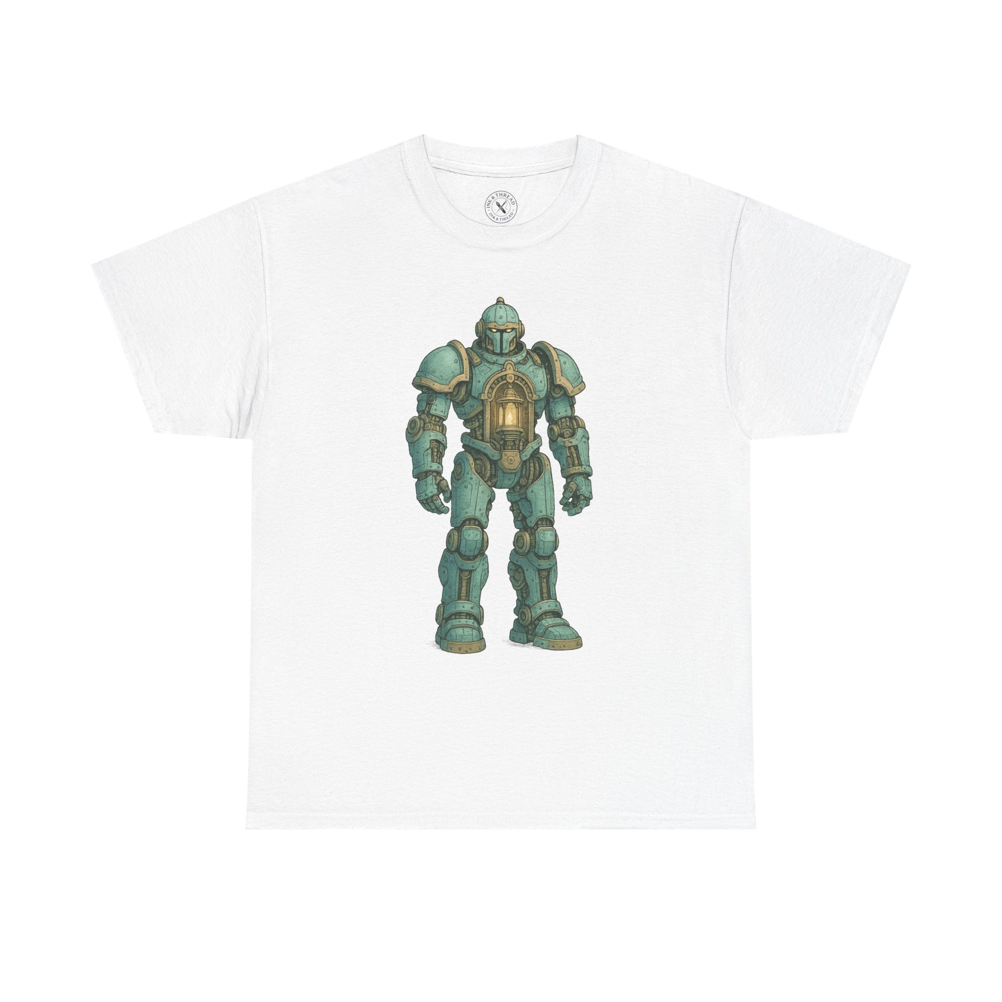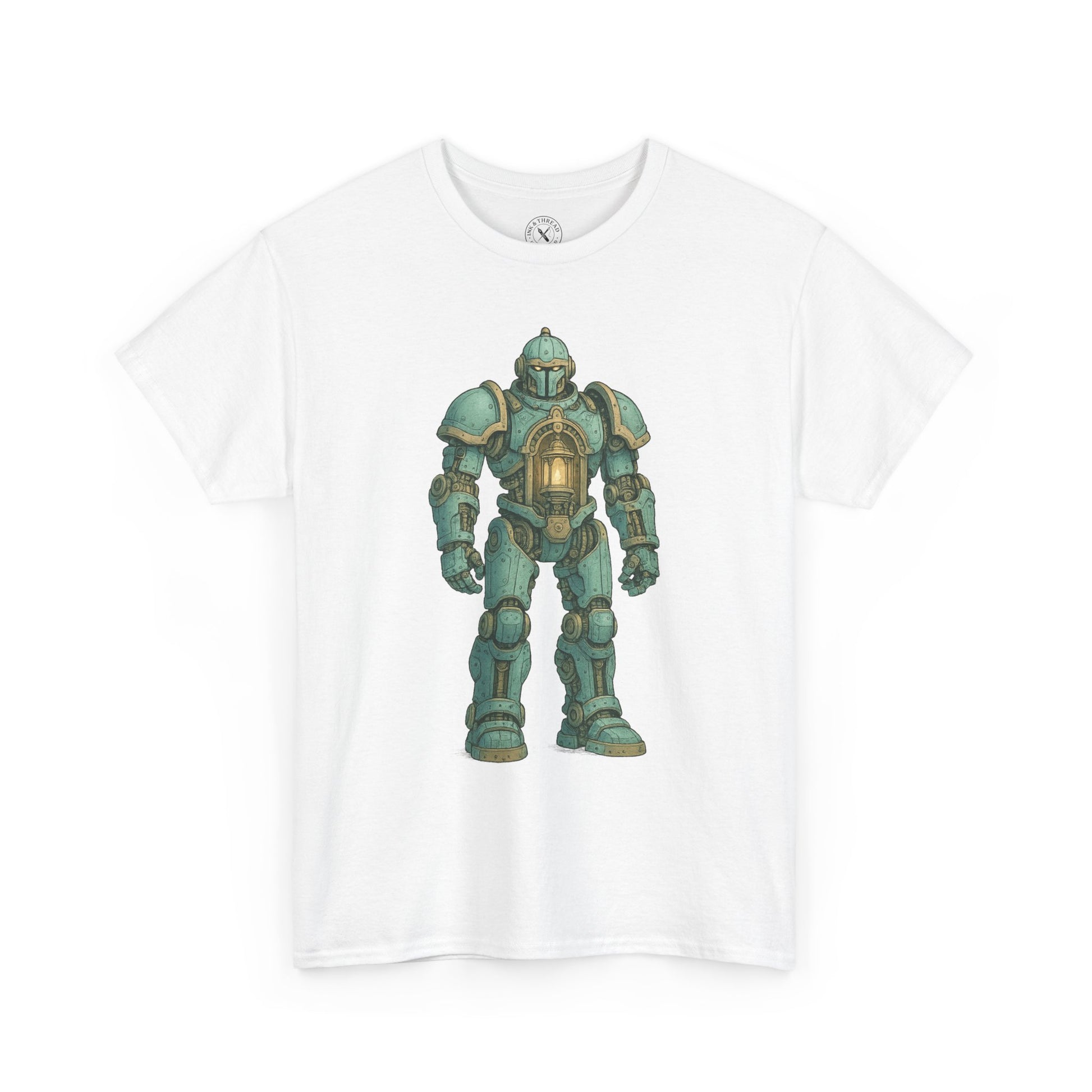 His frame, clad in smooth pastel-blue plates and golden bolts, is powered by silence and duty. Simple. Elegant. Immovable. Rendered with clean detail and glowing restraint, this design celebrates stillness, presence, and the machine-made monk that holds back the dark.