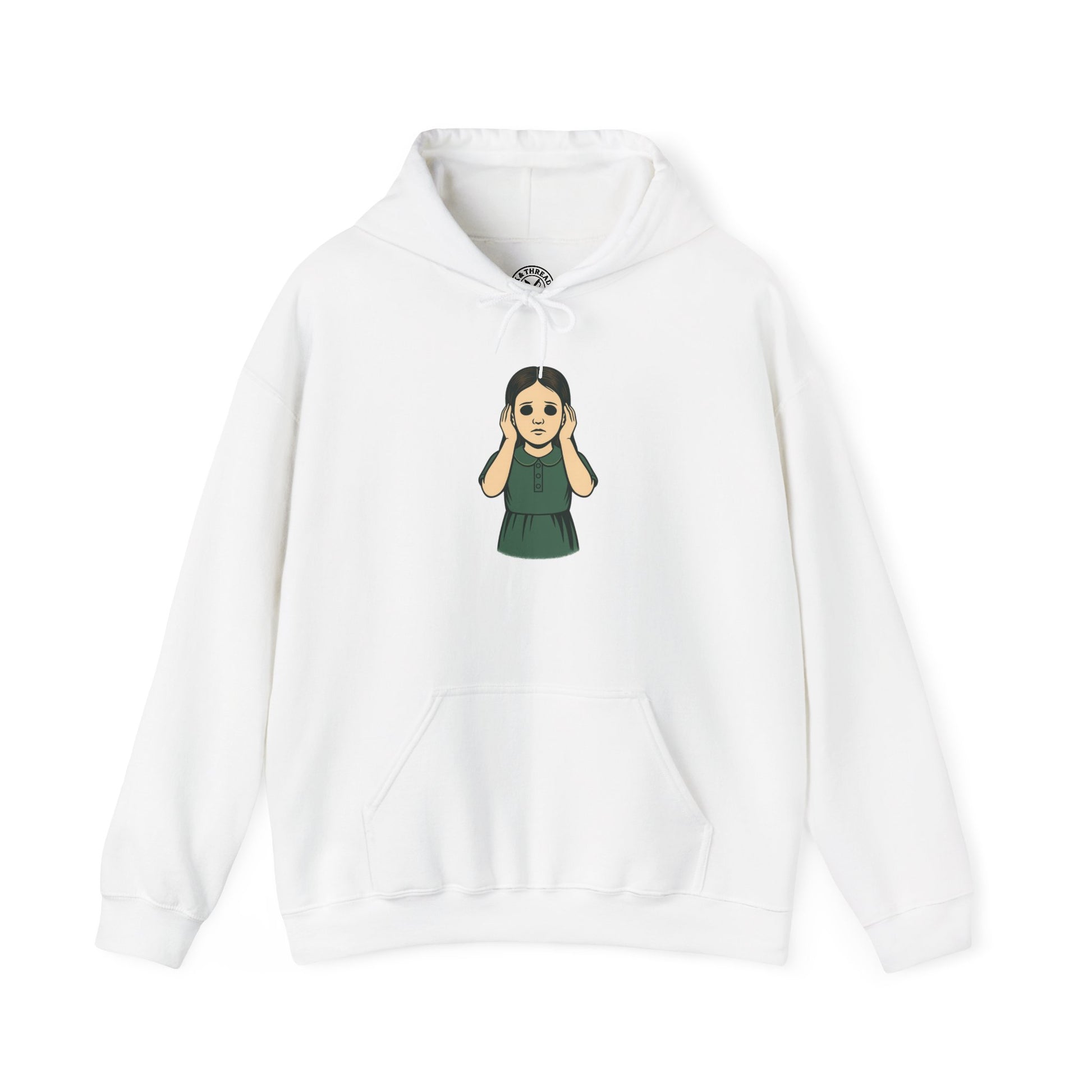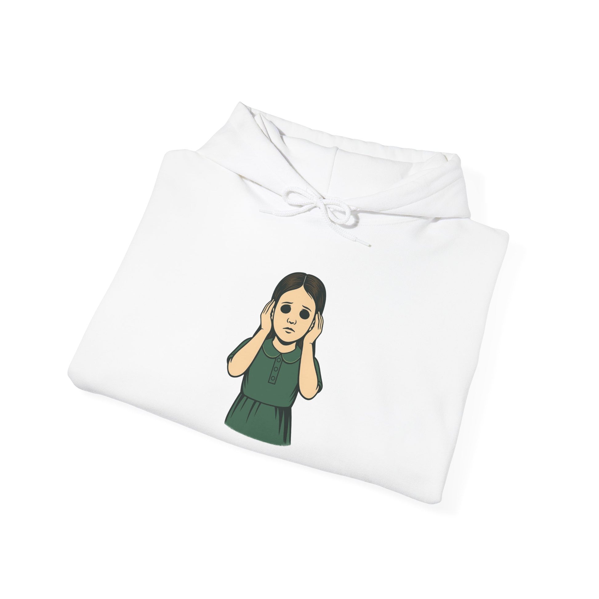 The Listener (Child) Hoodie portrays a hollow-eyed young girl frozen in eerie stillness, both hands pressed gently against her ears as if straining to catch a sound the rest of us cannot. Her blank, troubled expression and dark, empty eyes give the illustration a quiet but chilling emotional weight — a perfect fit for the atmospheric dread of The Hollow Ones collection.