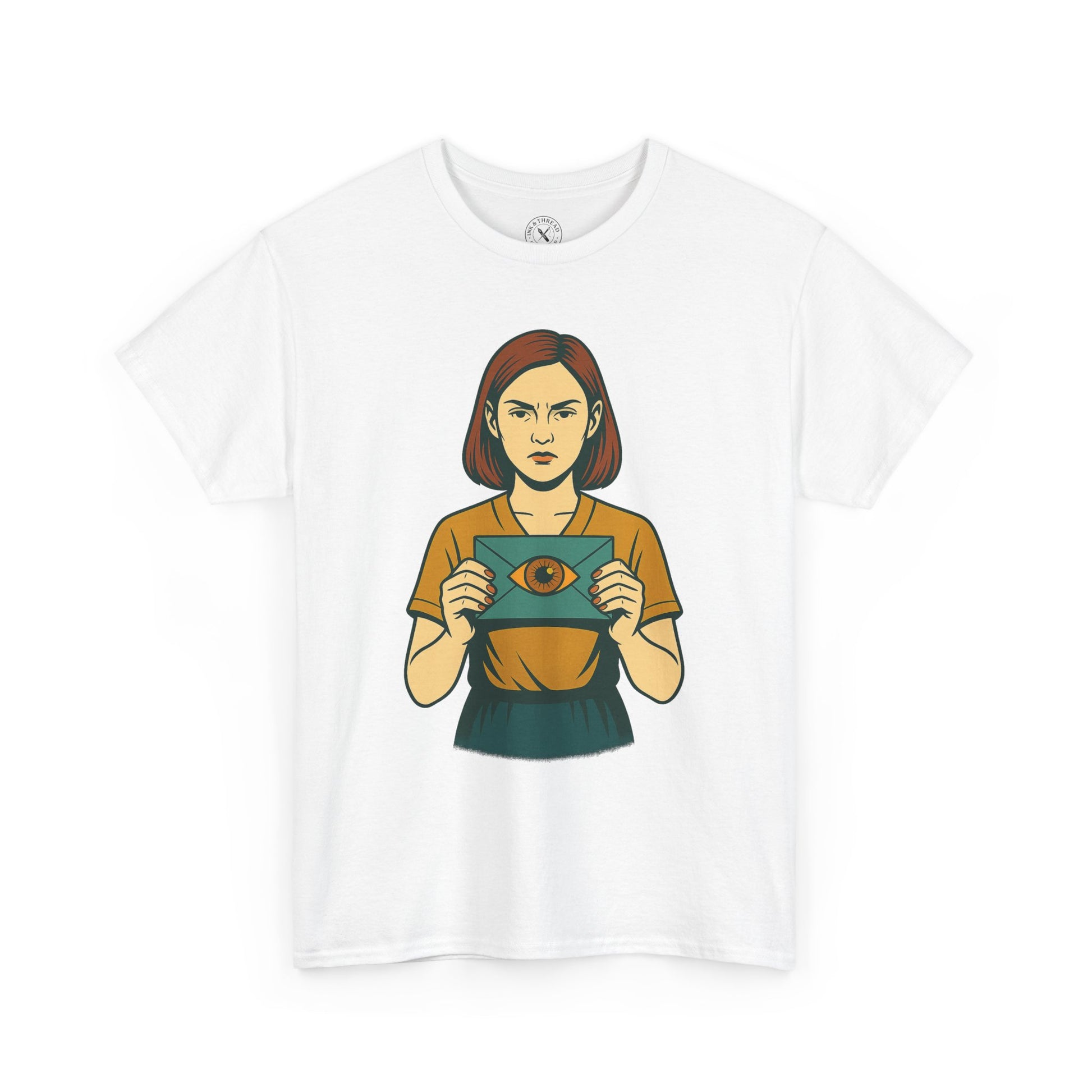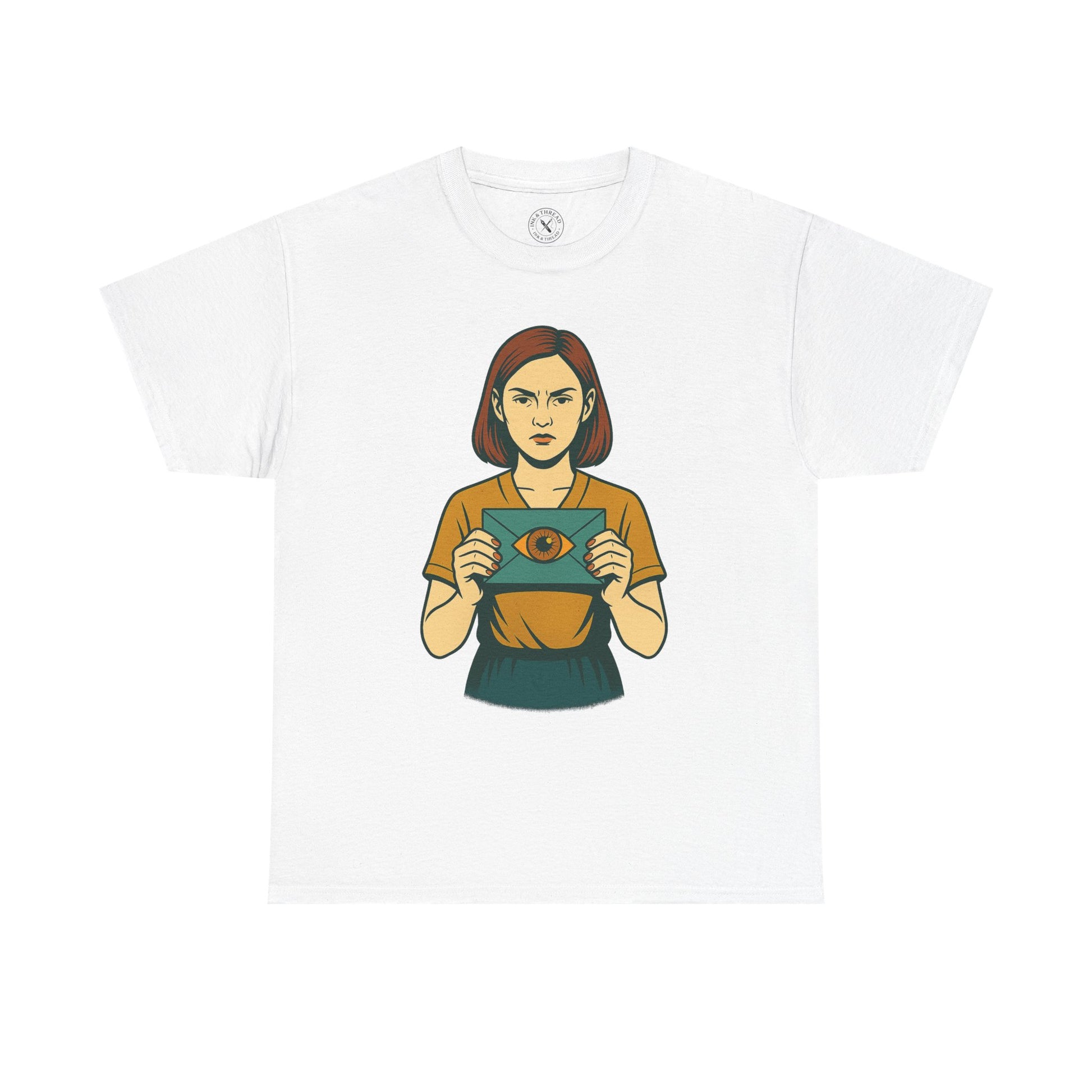 Words that cannot be spoken. The Message T-Shirt features a surreal child holding a folded paper while their mouth is bound shut, symbolizing secrets, silence, and hidden truths. Their tense gaze makes this design haunting and thought-provoking, pushing the Echoes collection into deeper cryptic territory.