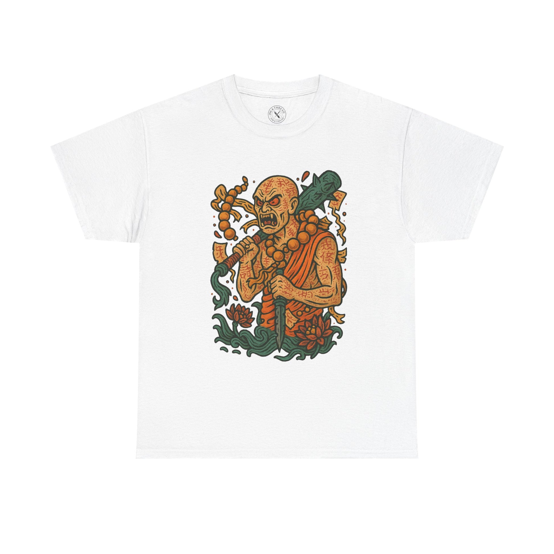 Detailed in fierce pastel hues, from ember orange to icy teal, his swirling prayer beads and lotus flames capture a moment of spiritual rupture. Traditional Japanese tattoo aesthetics elevate the design into something ritualistic, mythic — unforgettable.