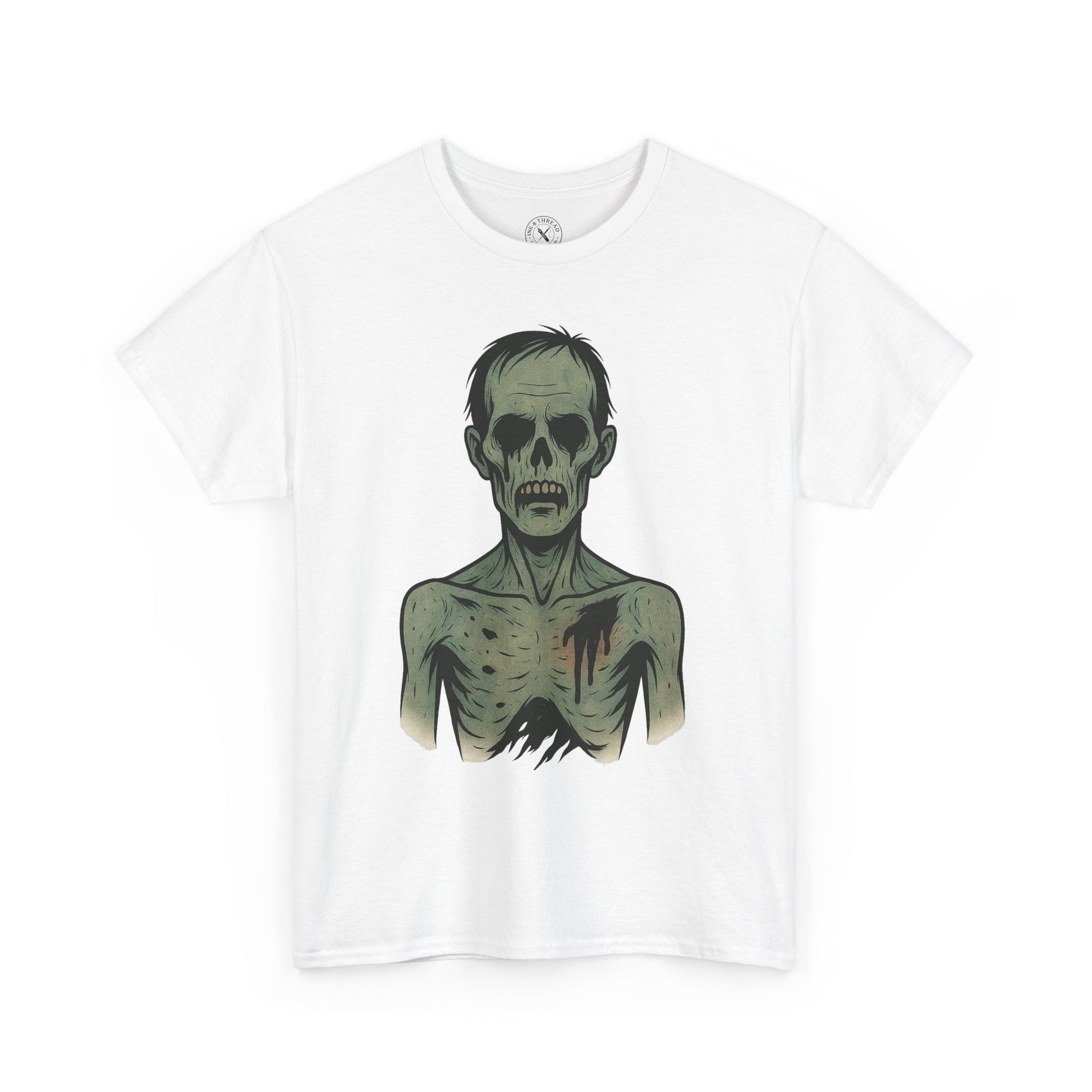 Shadow-soaked bruising, carved bone structure, and inky stains across the chest give this corpse a unique, unsettling presence while keeping the design clean, graphic, and merch-ready.