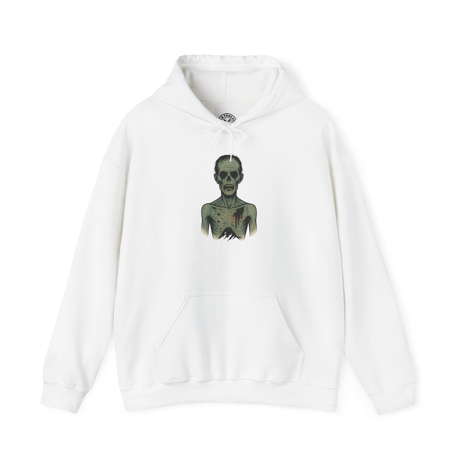 Shadow-drenched bruising, carved bone structure, and inky stains across the chest give this corpse a unique, unsettling presence while keeping the artwork clean, graphic, and hoodie-ready. The muted greens and bruised shadows add to its ghostly, death-soaked atmosphere.