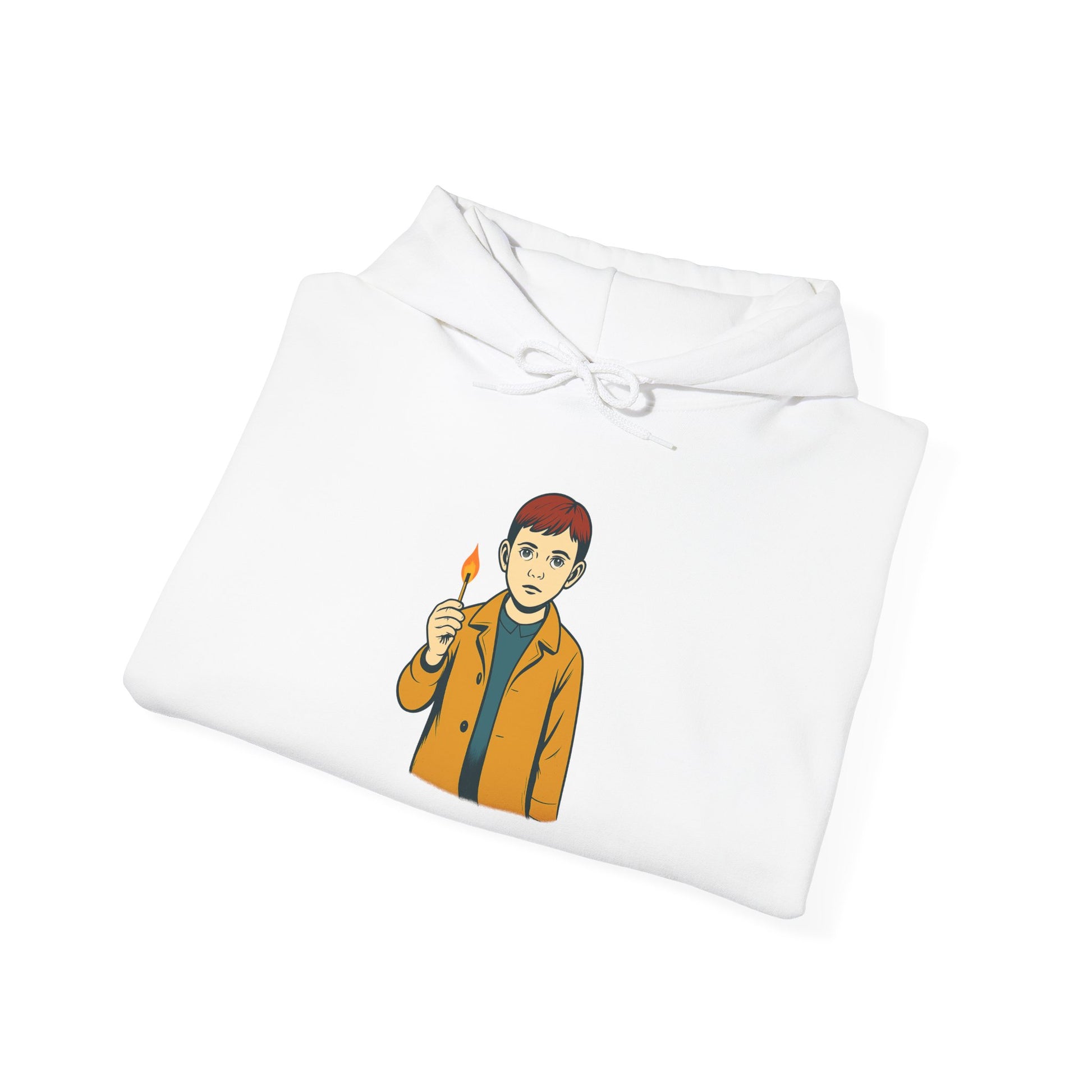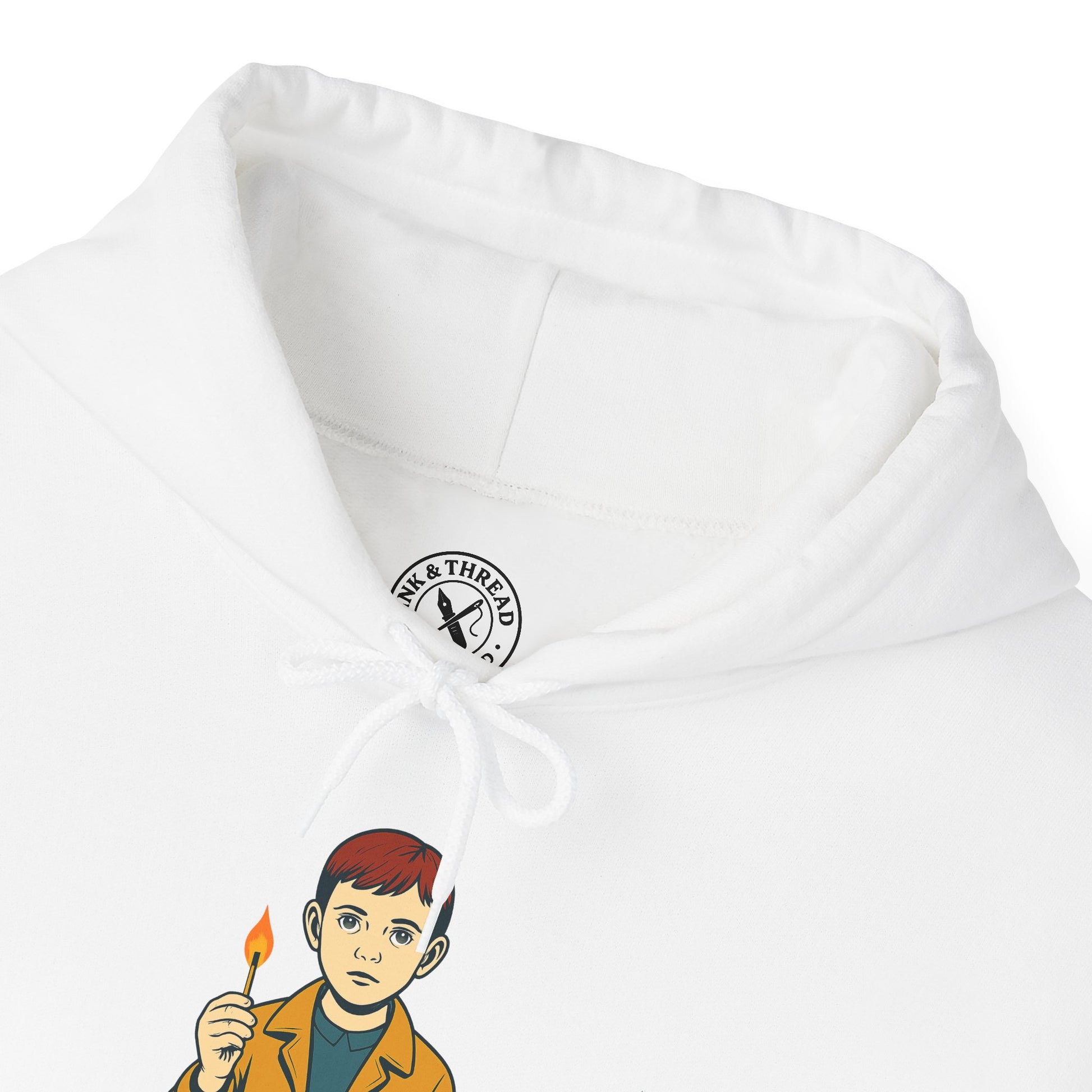 The Offering Hoodie captures a haunting moment of fragile warmth — a surreal child holding a single burning match, its flame the only point of color against soft grey and muted blue. Their wide, unblinking eyes reflect both fear and fascination — a quiet offering to whatever darkness lingers ahead.