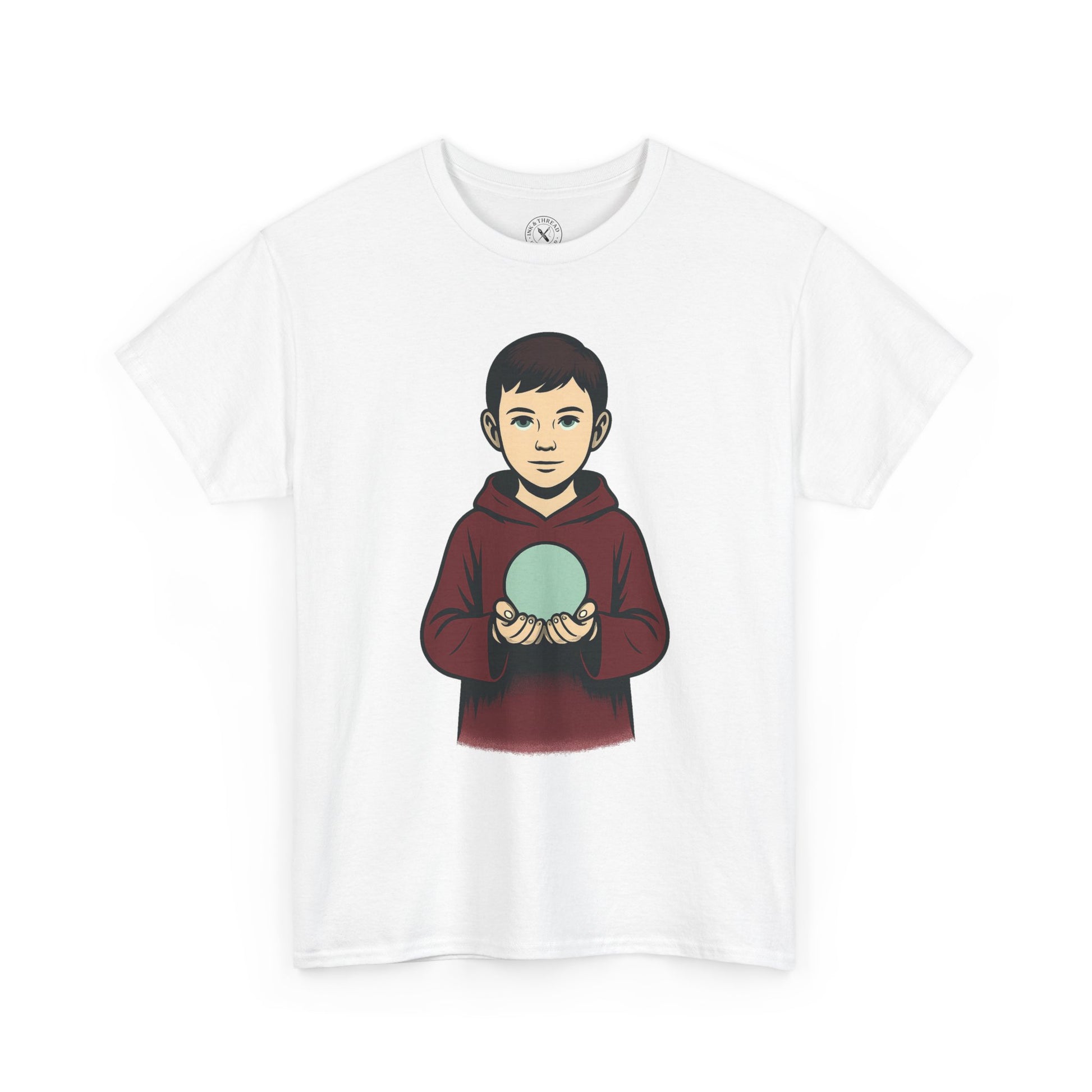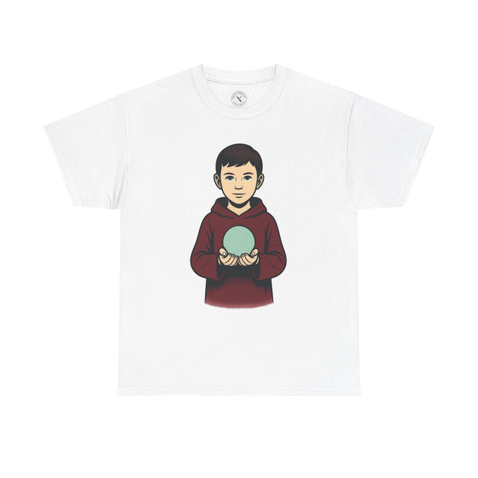 Light held, truth hidden. The Orb T-Shirt presents a surreal child cradling a pale teal-white glowing sphere, their faint, unsettling smile adding to the cryptic aura. With sharper facial features than other Echoes figures and dressed in a muted maroon cloak, this design breaks the repetition while deepening the strange symbolism of the collection.