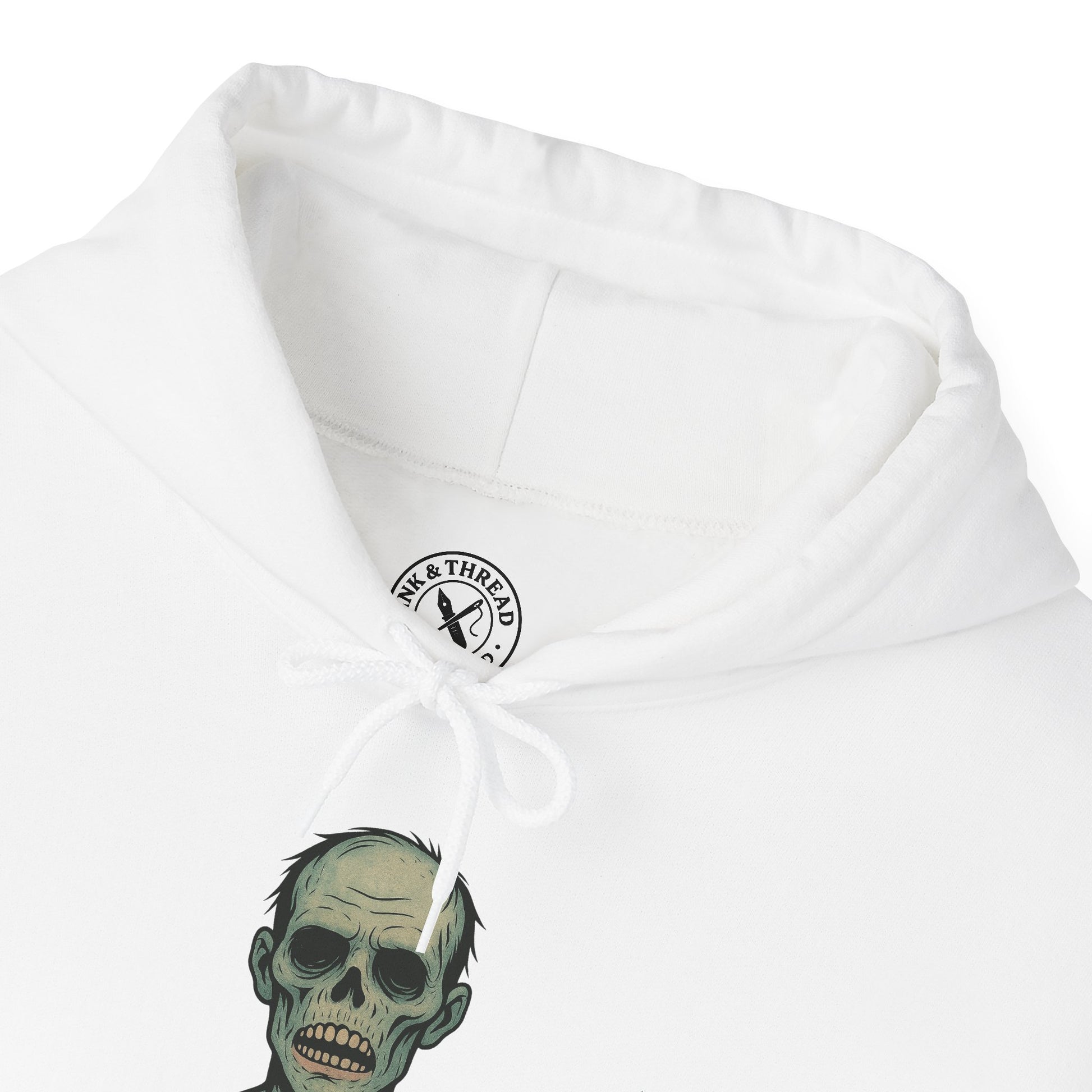 The Pale Walker Hoodie drags itself out of the forgotten — a skeletal, hollow-eyed corpse rendered in our signature Ink & Thread ink-tattoo style.